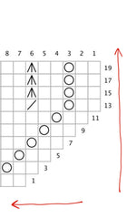 And they are easily memorised, for example in the repeated part of the chart below you can quickly see that the stitch repeat is simply ‘knit three, knit two together, yarn over, knit three’ and repeat all the way across the row.
