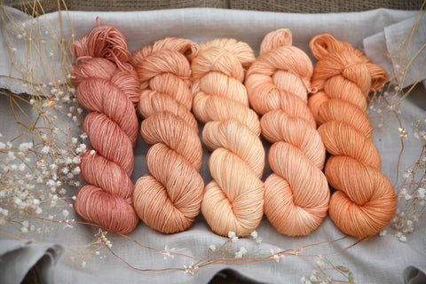 On the left we’ve got Bog Myrtle; this is the most red of the set, in fact it’s a bit of an add colour in my opinion but I really love it! Next from the left we’ve got Oatfields. Last time I dyed both this and Falling Leaves (which is much more golden-brown and less orangey) they were almost indistinguishable, which is really what prompted this big recipe review. So Oatfields has been brought back to where I wanted it - more orangey gold. It’s inspired by fields of oats in a glowing sunset. Now I’m going to skip to the right hand side and work to the centre - we’ve got Wallflower which is the most orange of these, with a lovely glowing yellow undertone (it’s hard to capture that in photos). This was Crocosmia, but I’m trying to keep my hand dyed shade names different to their mill-dyed counterparts even if they’re the same colour.. so I have finally got around to renaming it. I love this colour, but it is quite rich. It definitely won’t be to everyone’s taste! So on a whim I also created a lighter version of it (second skein from the right). It’s not literally the same recipe halved, because that doesn’t generally work (that’s another blog post I think), but it is a lighter, softer orange. More of a sping-spring-time shade compared to the richness of Wallflower. I’ve named this lighter orange Cloudberry after the orange berries. Finally, in the centre we have a colourway called Grace. It’s so named after a rose.. as are many of my colours! I dyed this to check that it’s not too close to Cloudberry (and a few other shades, e.g. Mellifer and Apricot Tulip). It’s hard to tell in the pics but they’re actually pretty dissimilar - Grace is much more yellow than Cloudberry. In case you’re wondering, Mellifer is a light honey colour, and Apricot Tulip is of course much more peachy.