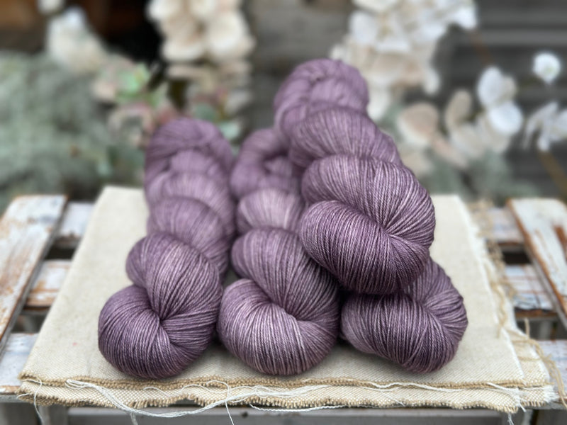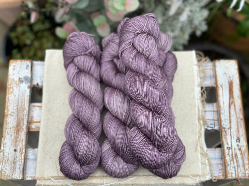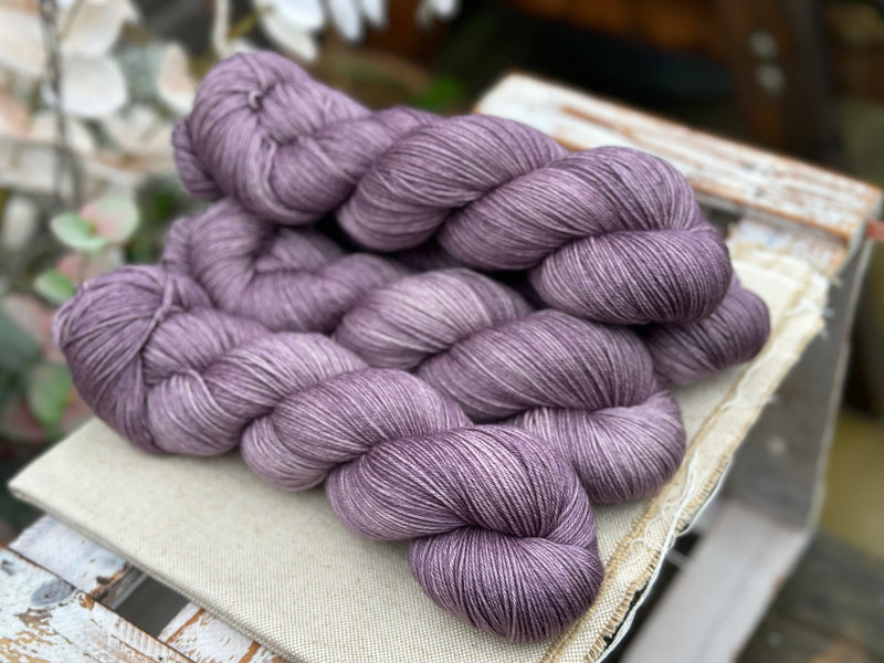 Hand dyed pure superwash merino 4ply sock yarn in colourway Thunder - a medium- to dark-toned faded grey-purple.