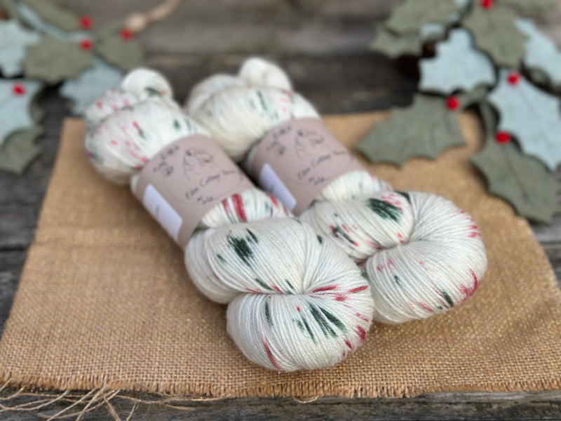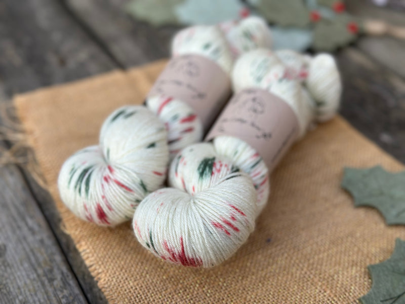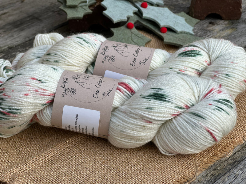 Hand dyed superwash merino, nylon and gold stellina 4ply yarn in colourway Mistletoe.