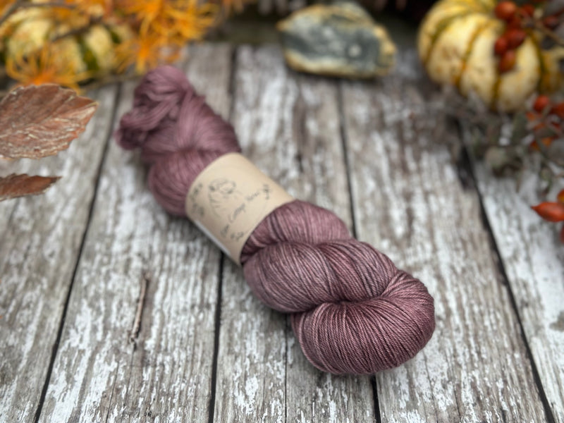 Hand dyed superwash merino and silk 4ply sock yarn in colourway Heliotrope - a medium toned soft aubergine pink.
