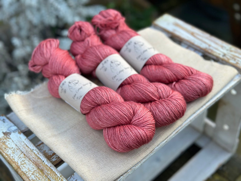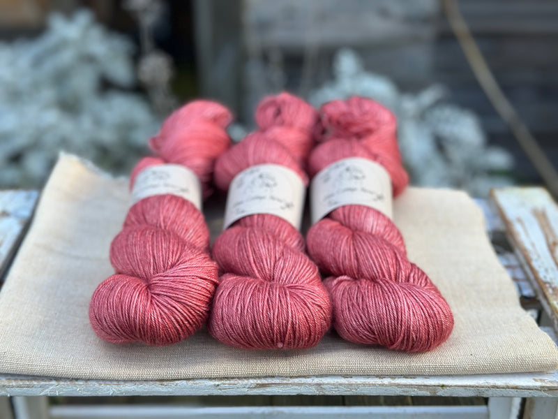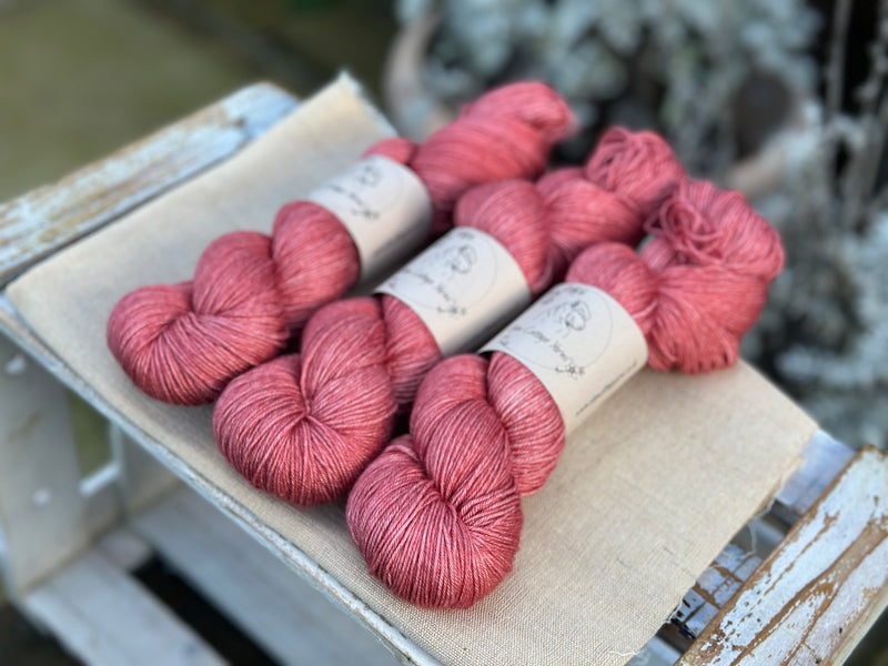 Hand dyed superwash merino and silk 4ply sock yarn in colourway Red Goosefoot.