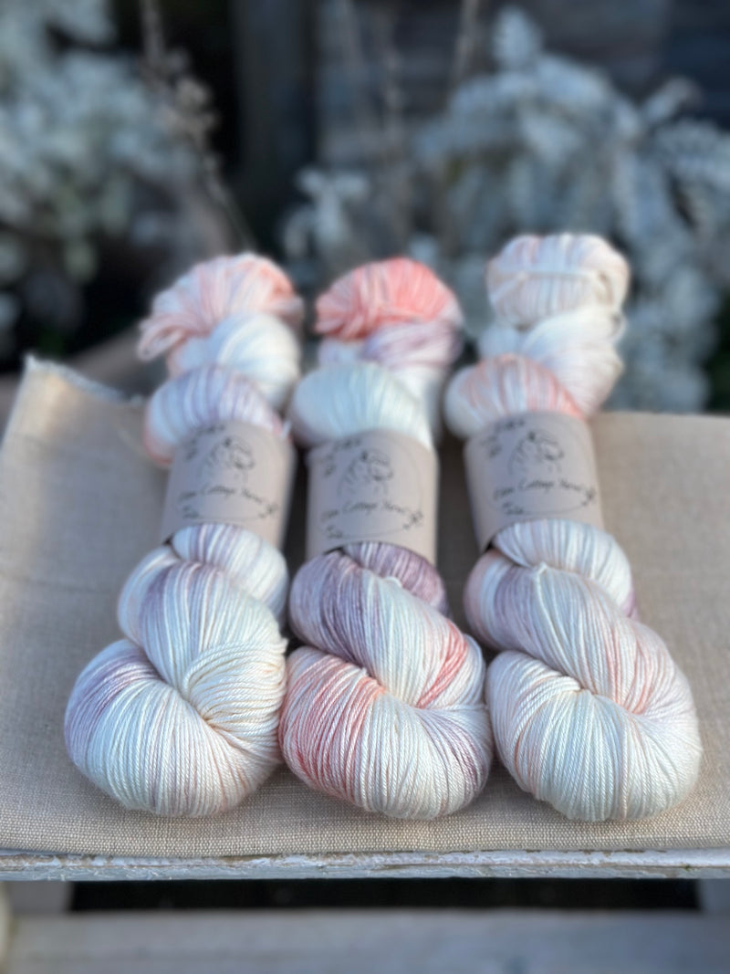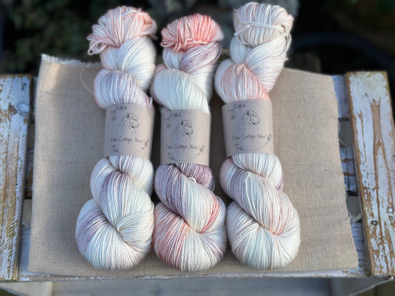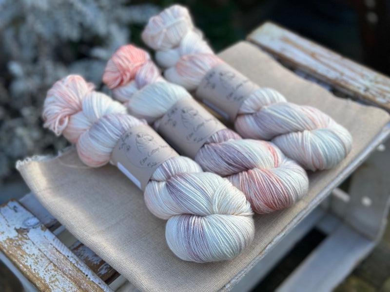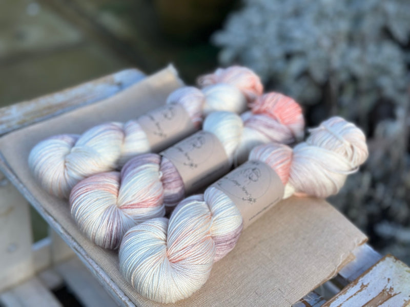 Hand dyed superwash merino and silk 4ply sock yarn in colourway Straw Daisy.