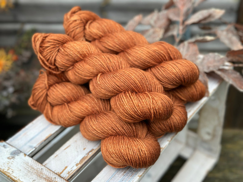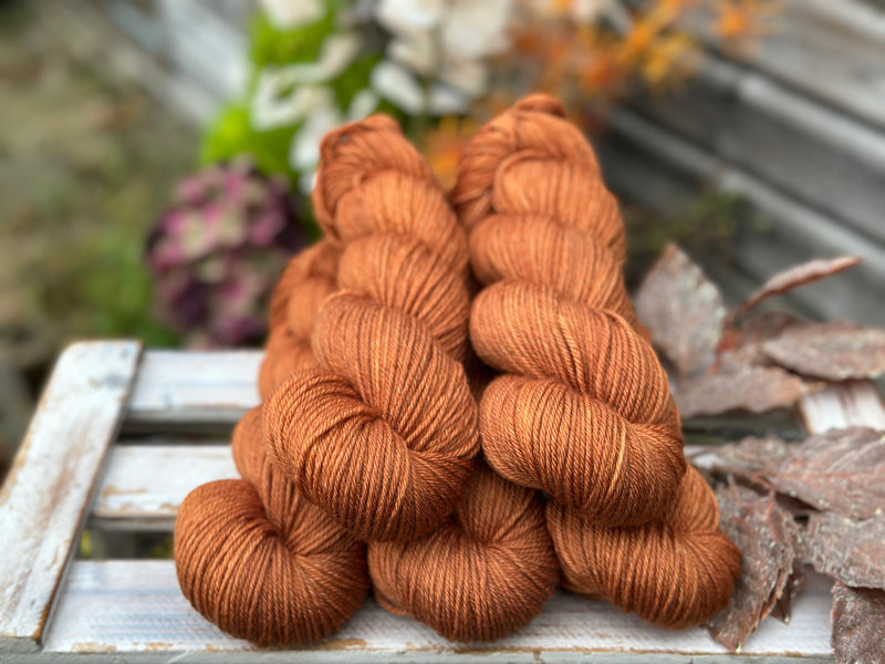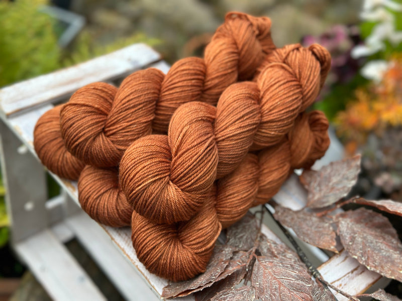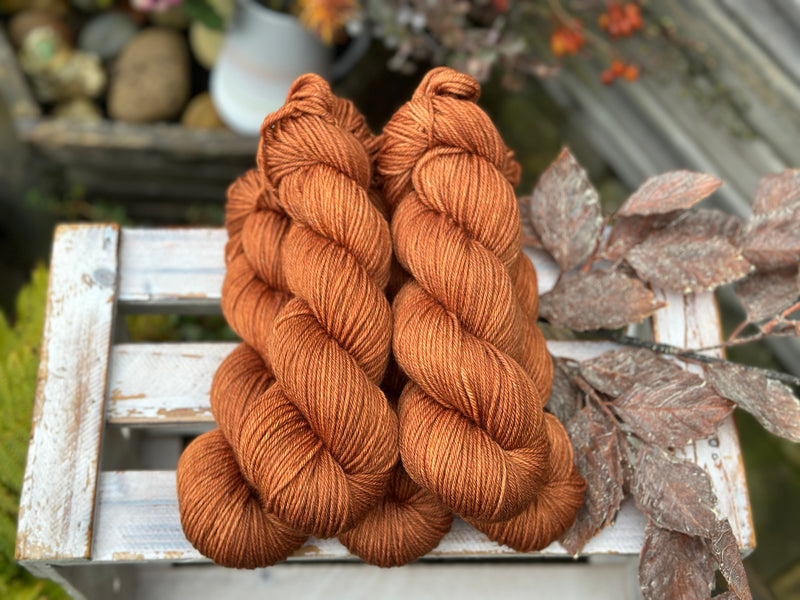 Hand dyed superwash merino and nylon DK yarn in colourway Rust - a rich, saturated dark russet.