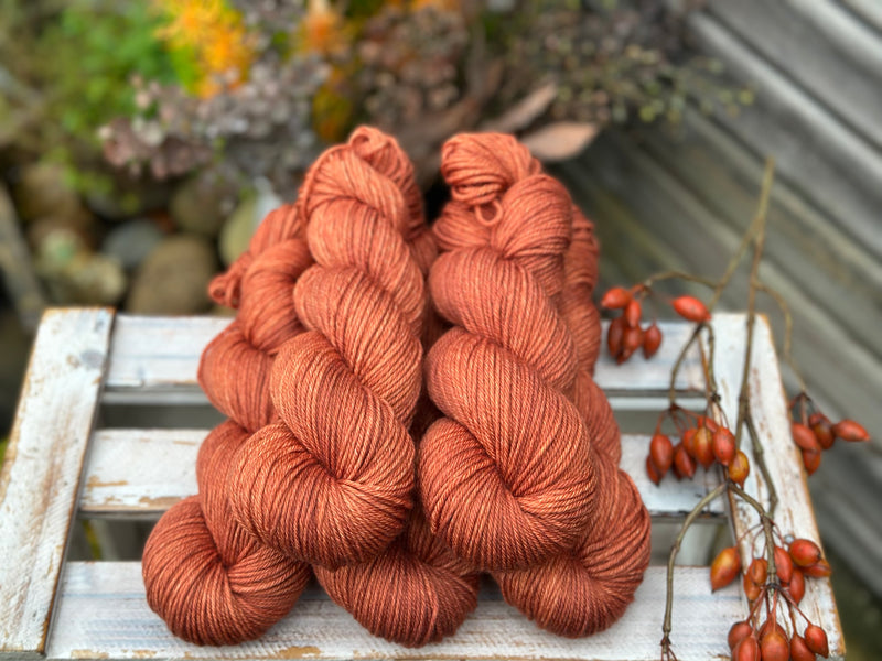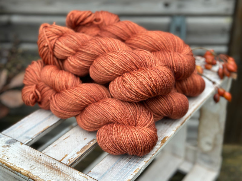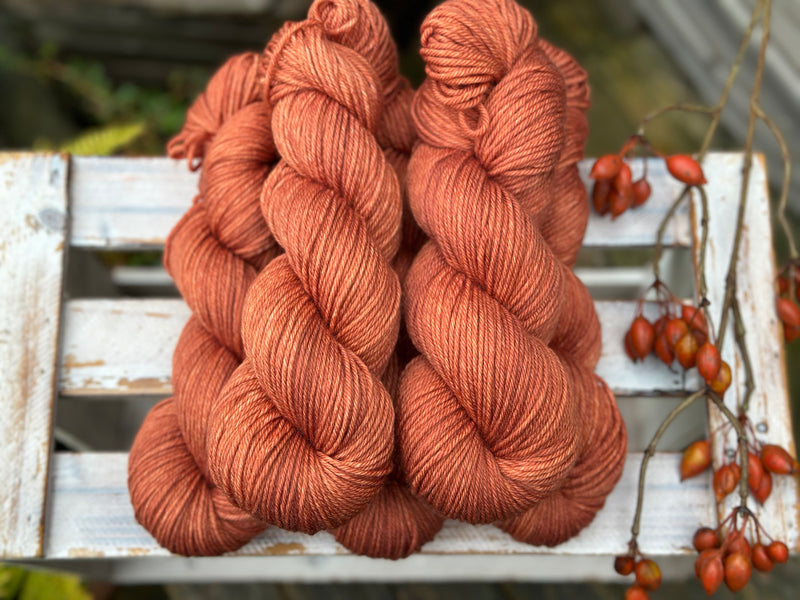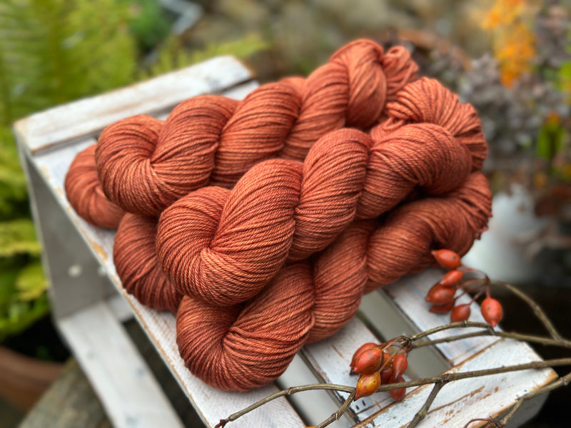 Hand dyed superwash merino and nylon DK yarn in colourway Terracotta.