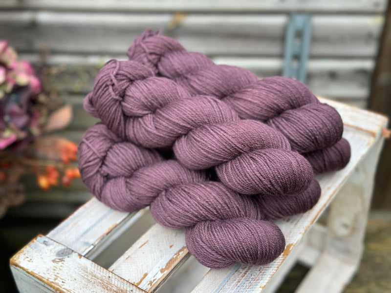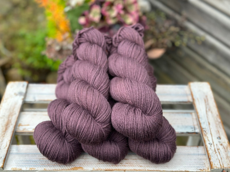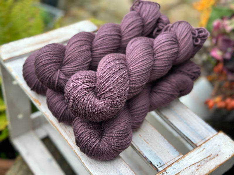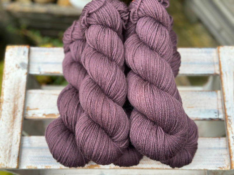 Hand dyed superwash merino and nylon DK yarn in colourway Black Magic Rose - a dark velvety mauve/aubergine.