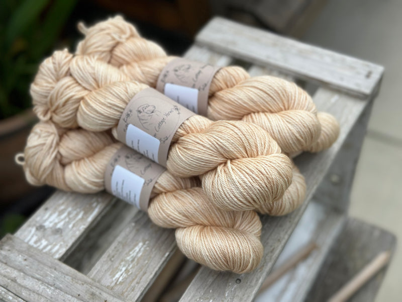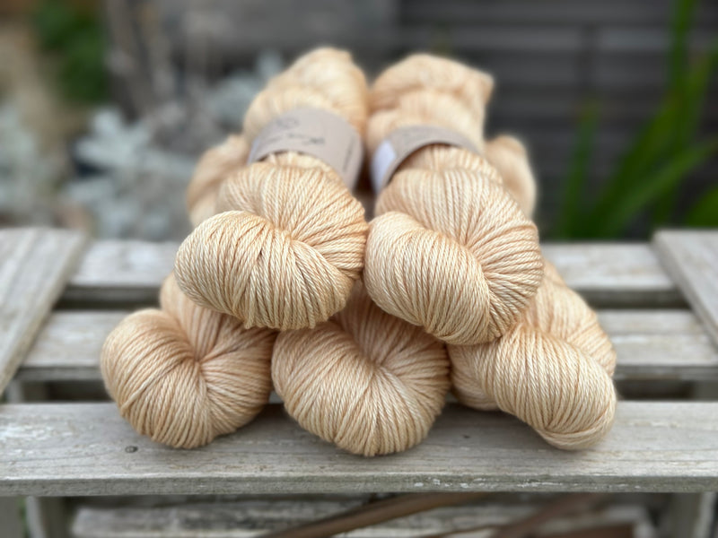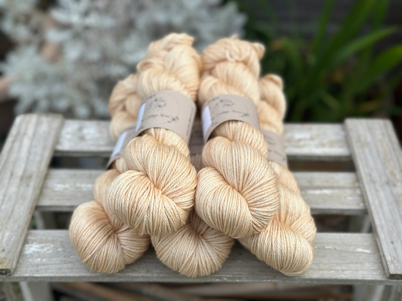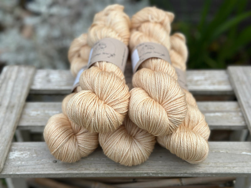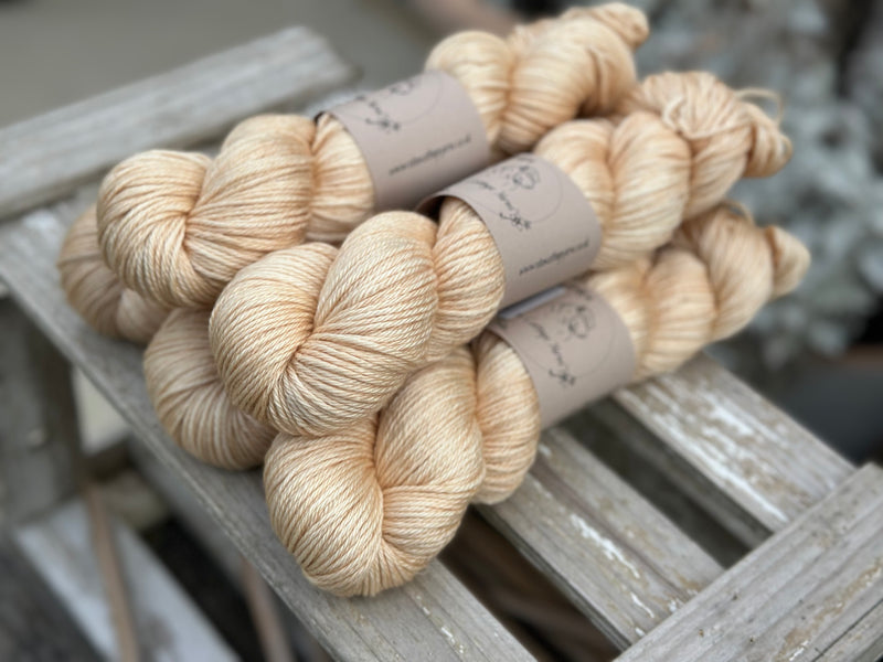 Hand dyed superwash merino and silk DK yarn in colourway Whispering Grass - a warm golden yellow.