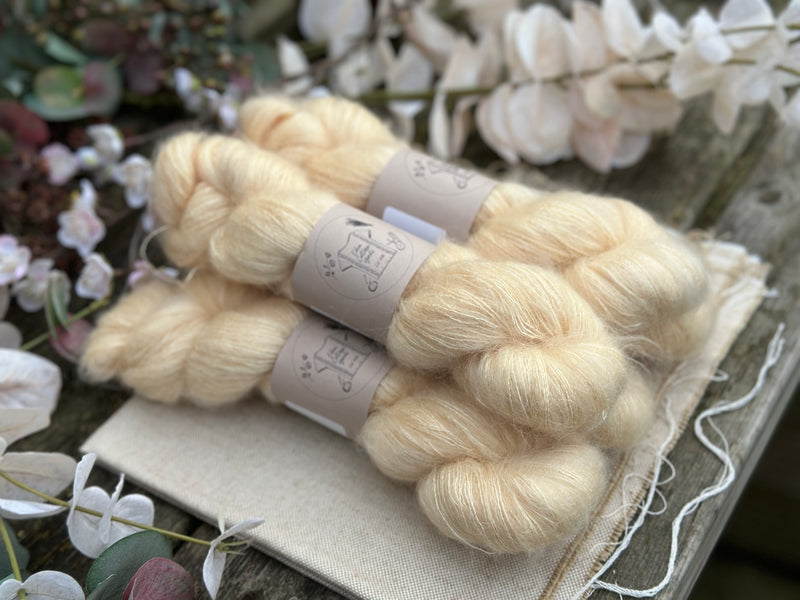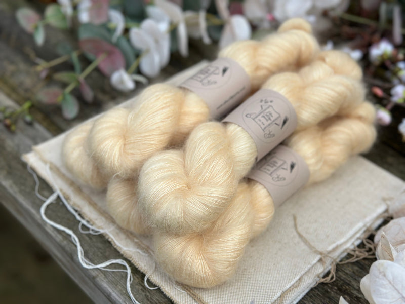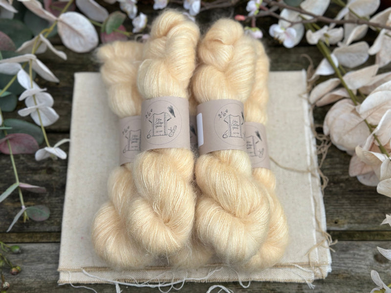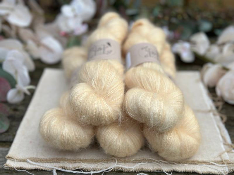 Eldwick Lace is a luxuriously soft blend of mohair and silk. The mohair is naturally fluffly and gives this yarn its signature halo. This yarn is ideal for delicate lace designs in both knitting and crochet and can also be held double with other yarns to add the soft, fuzzy halo to larger garments.
