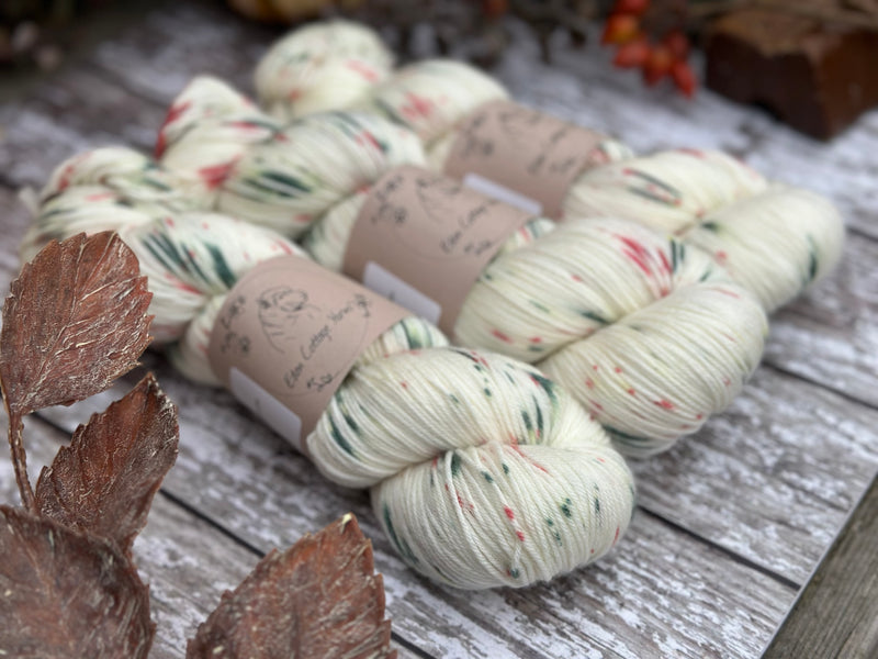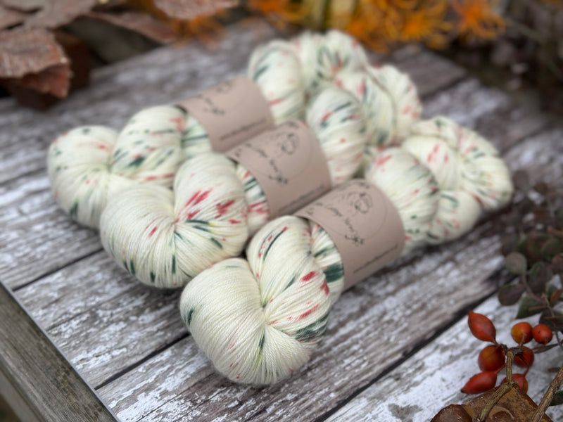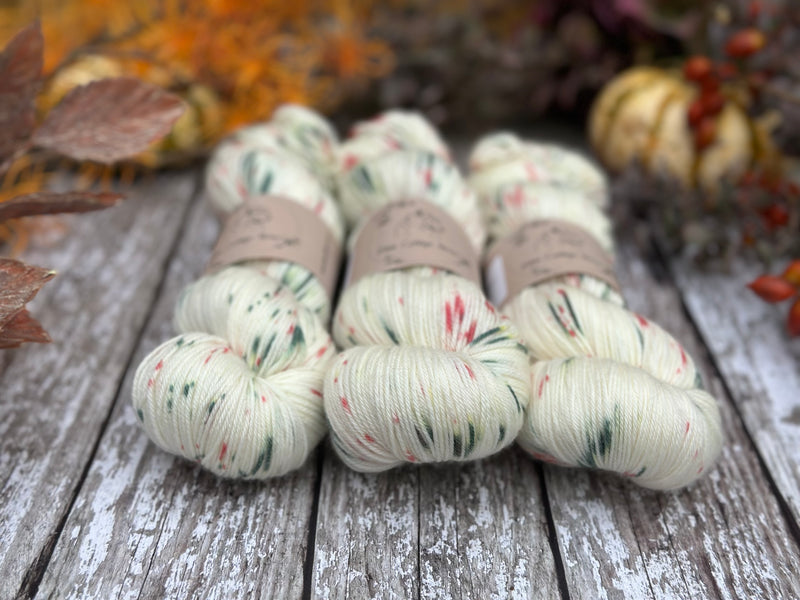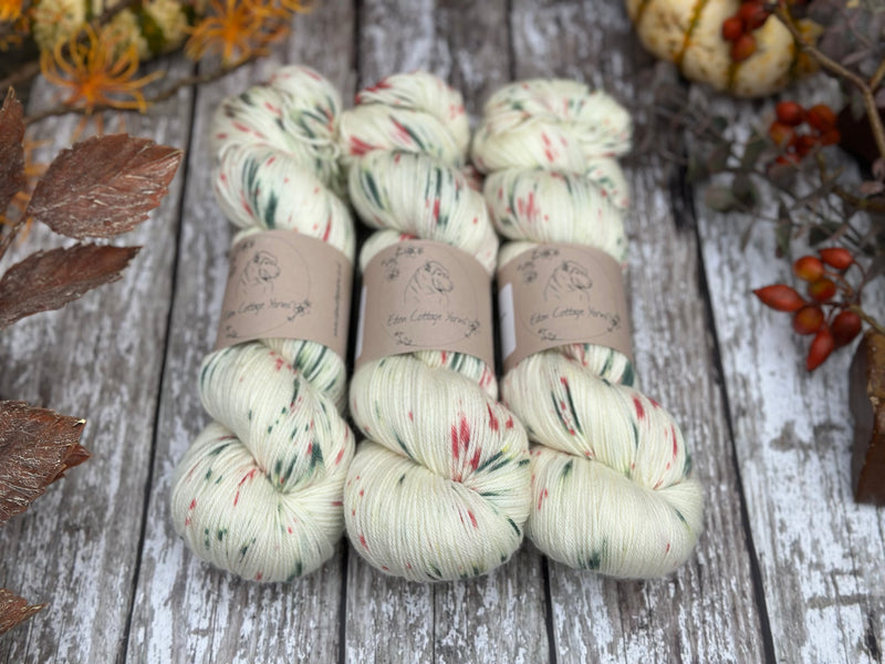 Hand dyed superwash merino with nylon 4ply sock yarn in colourway Mistletoe - dapples of ivy green and berry red on a natural cream base.
