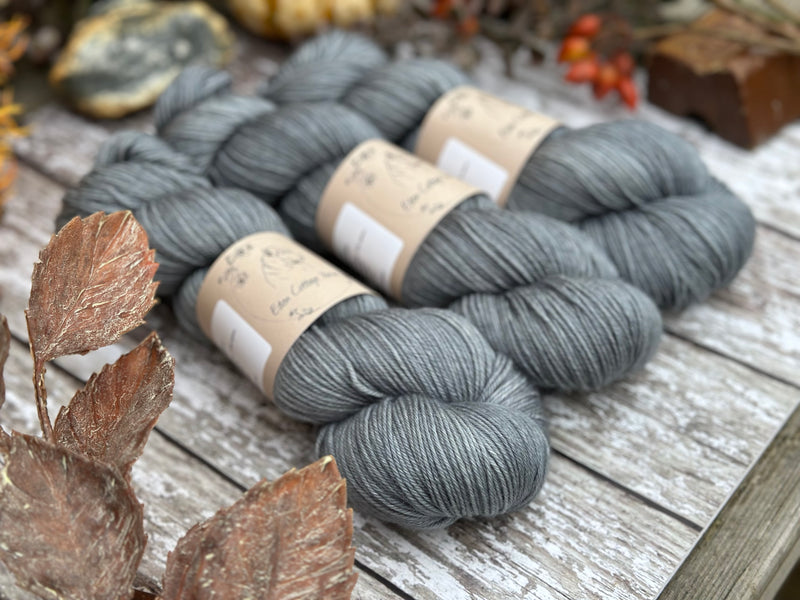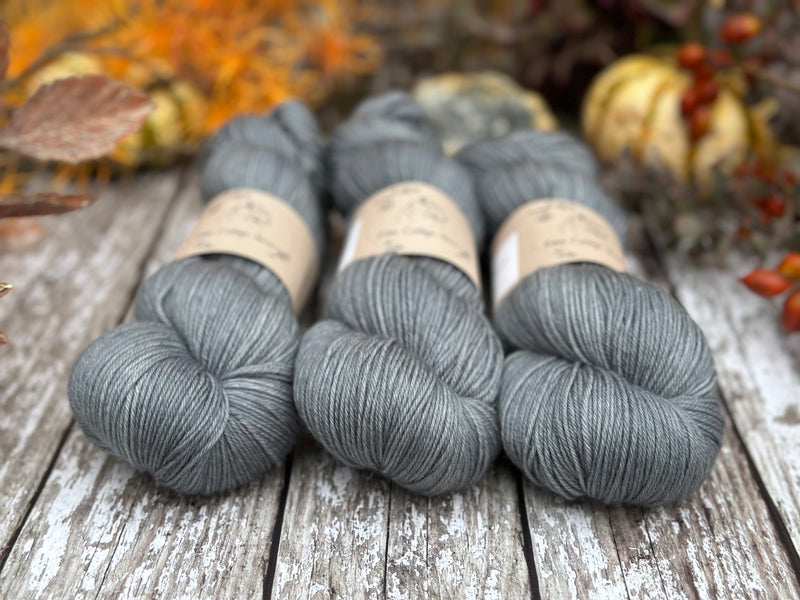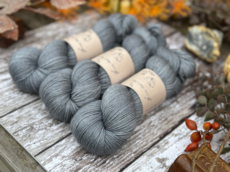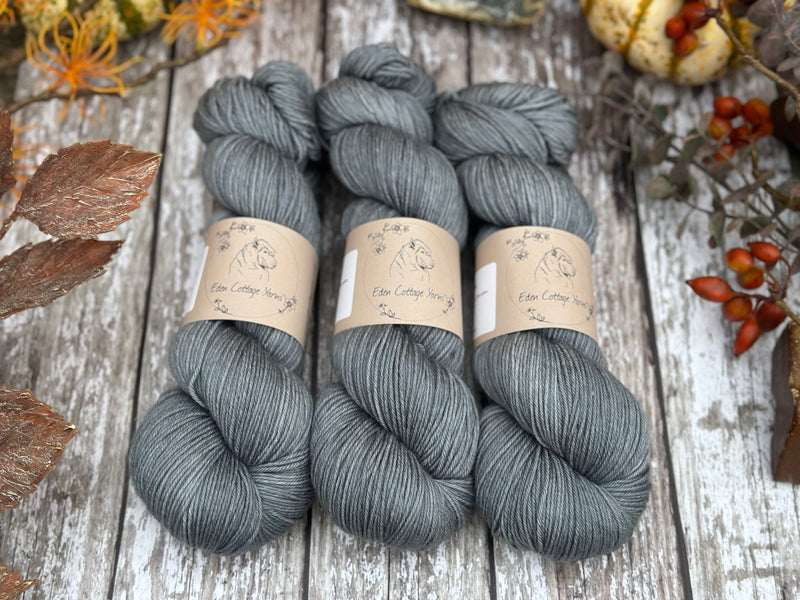Hand dyed superwash merino with nylon 4ply sock yarn in colourway Pennine Mist - a stonewashed, warm, medium-toned grey-blue.
