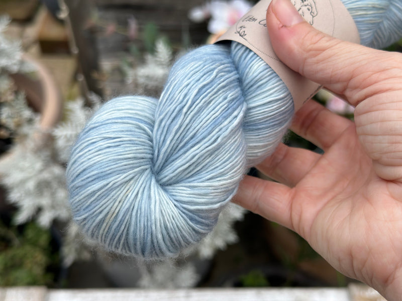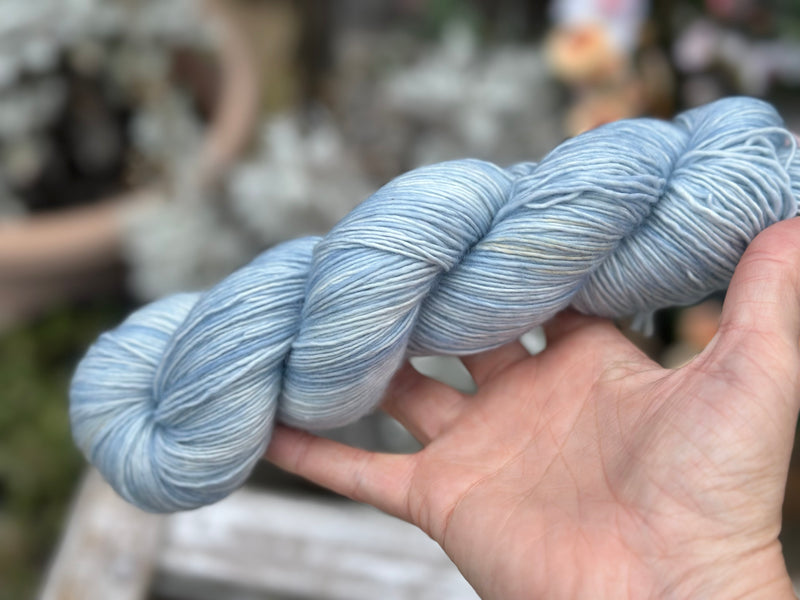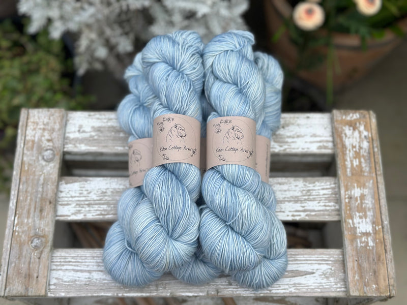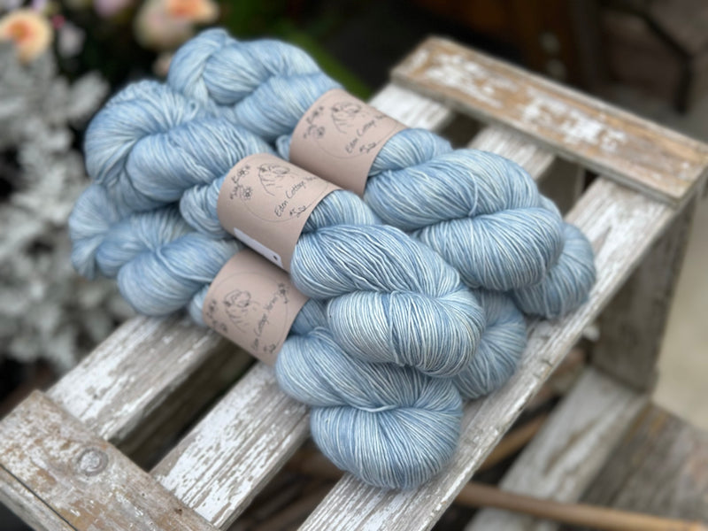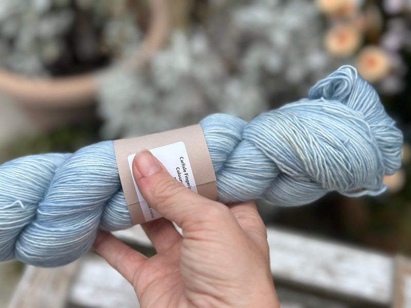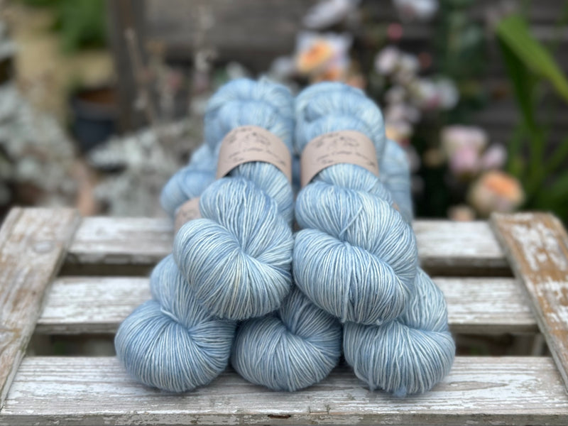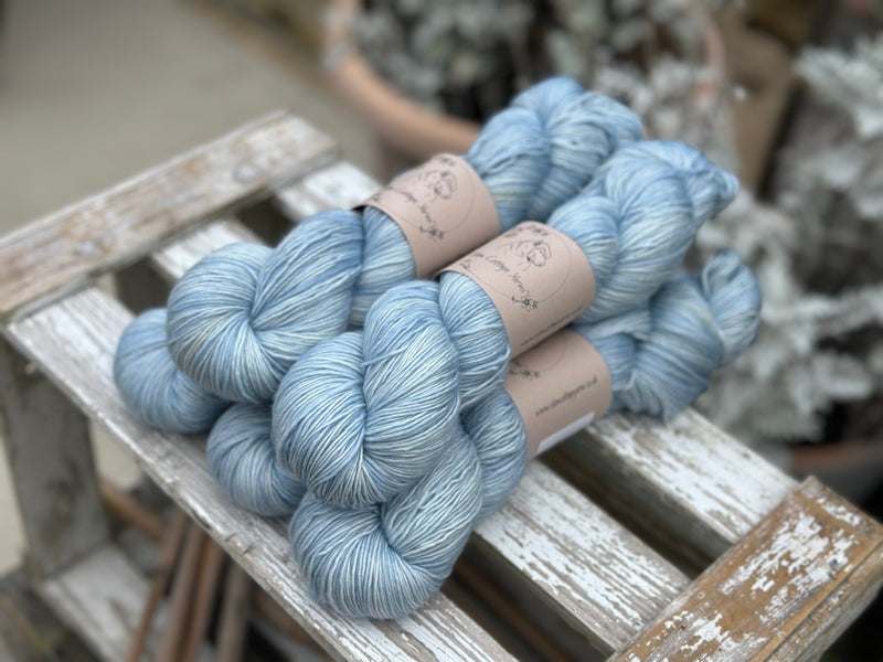 Hand dyed 100% merino fingering yarn in colourway Campanula – this is a soft grey-tinged light blue. Note that two of these skeins are seconds due to some light discolouring. Please see photos. To choose to buy these please select Seconds Skeins from the drop down box.