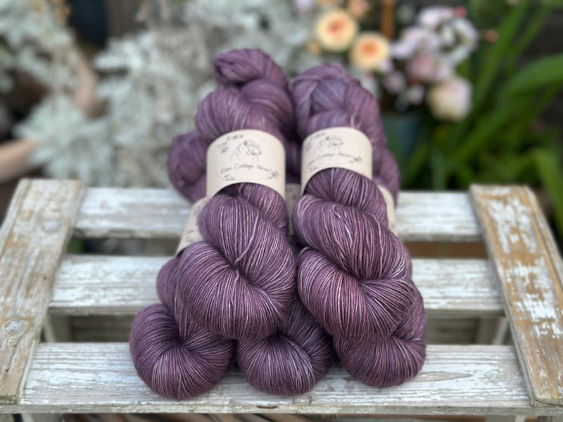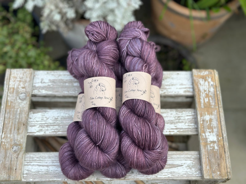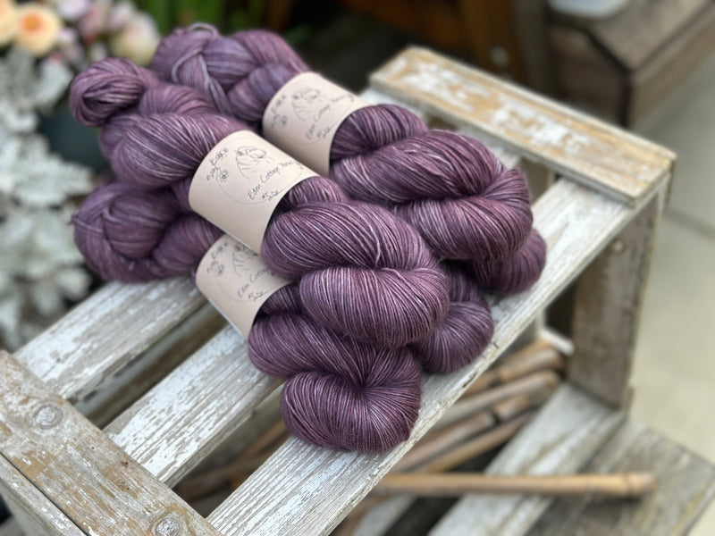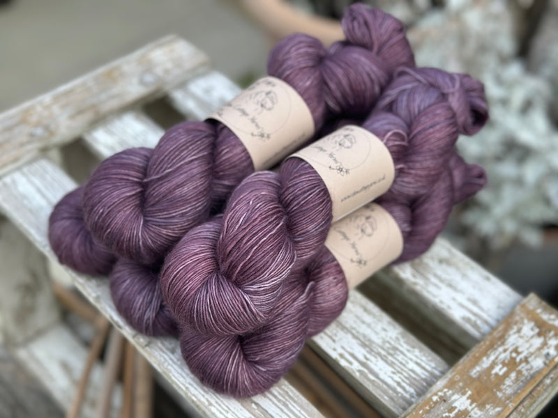 Hand dyed 100% merino fingering yarn in colourway Elderberry.