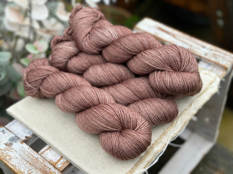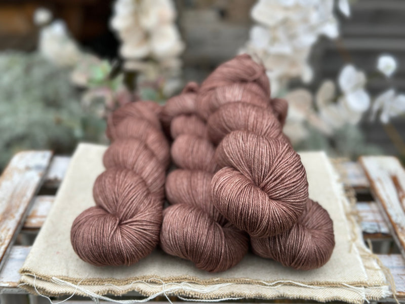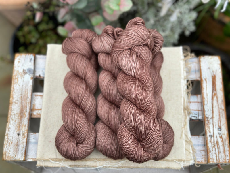 Hand dyed pure superwash merino 4ply sock yarn in colourway Oak - a medium-toned rosy brown.