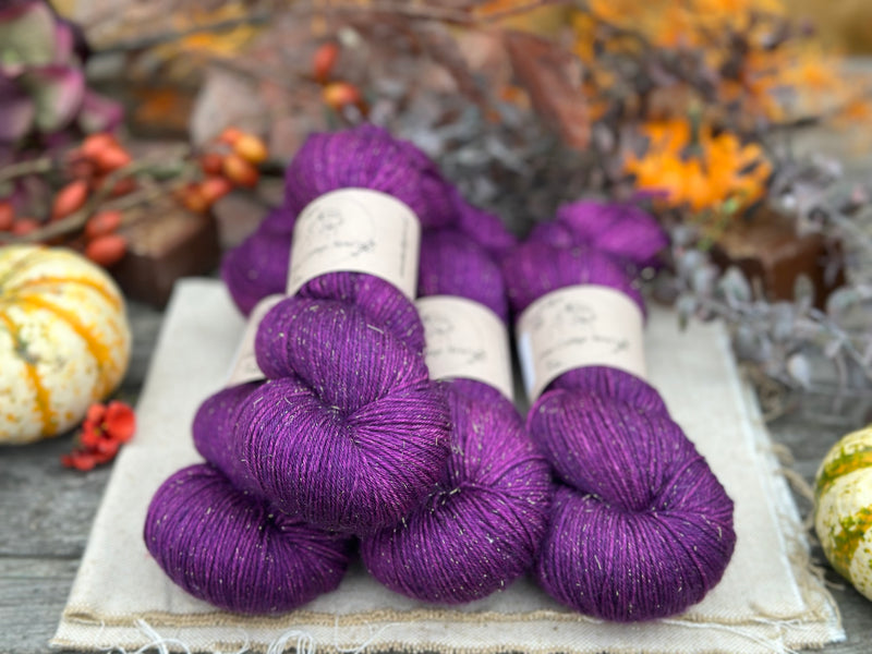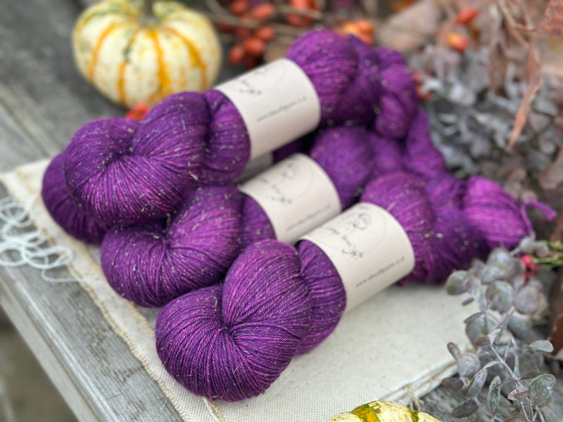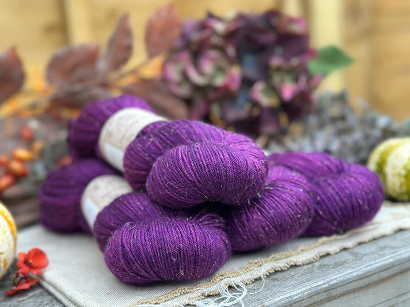 Hand dyed superwash merino, nylon and gold stellina 4ply yarn in colourway Buddleja - a rich pinkish purple inspired by the richly scented flowers of the 'butterfly plant'.