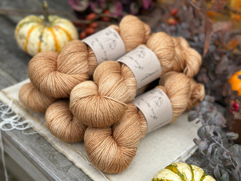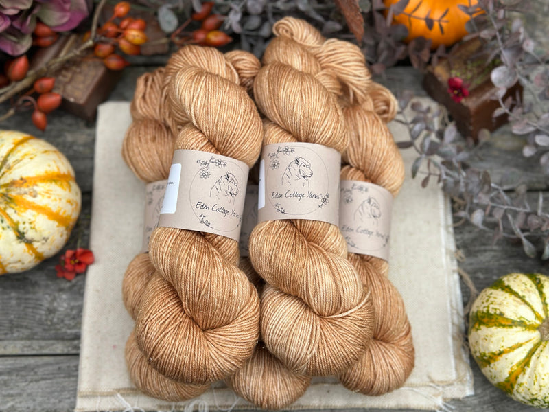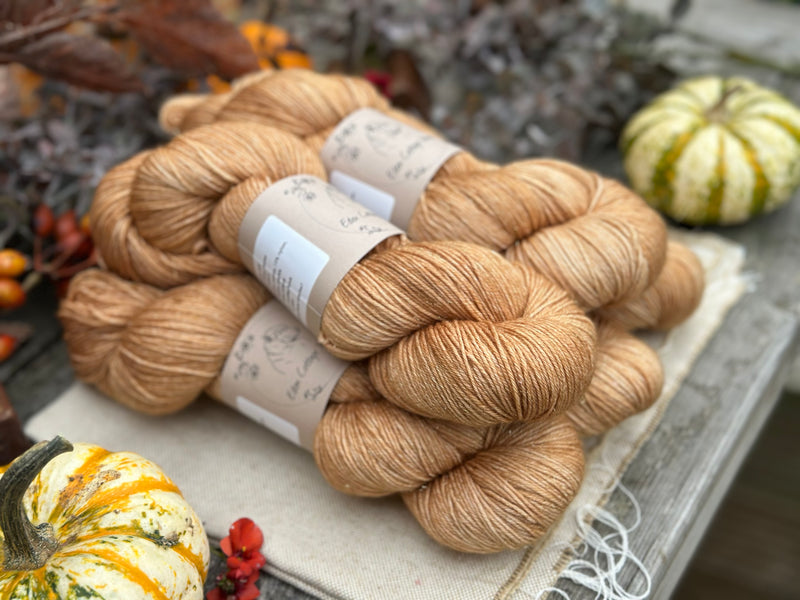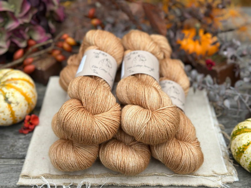 Hand dyed superwash merino, nylon and gold stellina 4ply yarn in colourway Falling Leaves - a soft, medium-toned gold.