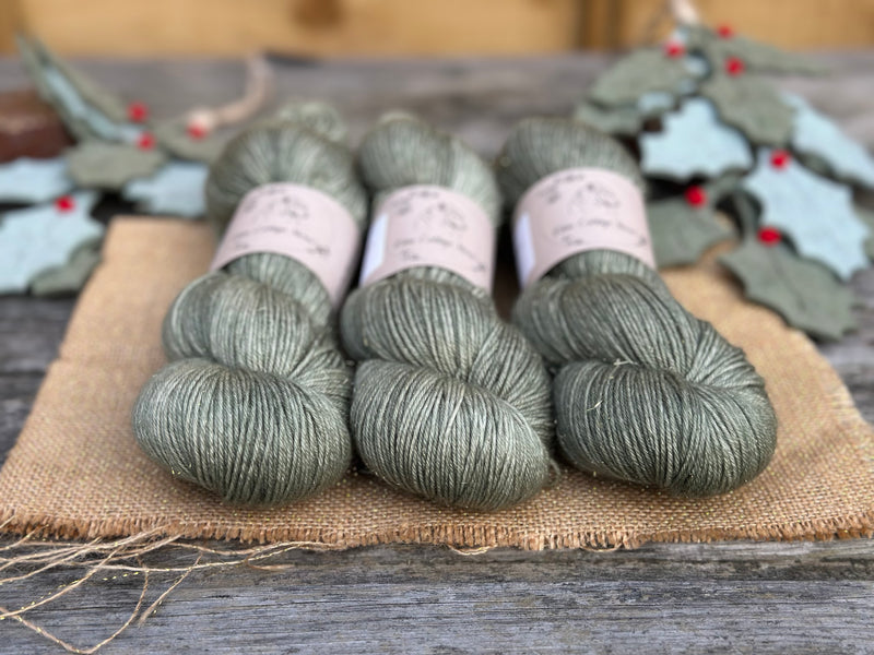 Hand dyed superwash merino, nylon and gold stellina 4ply yarn in colourway Ivy - a medium stonewashed shade of green.
