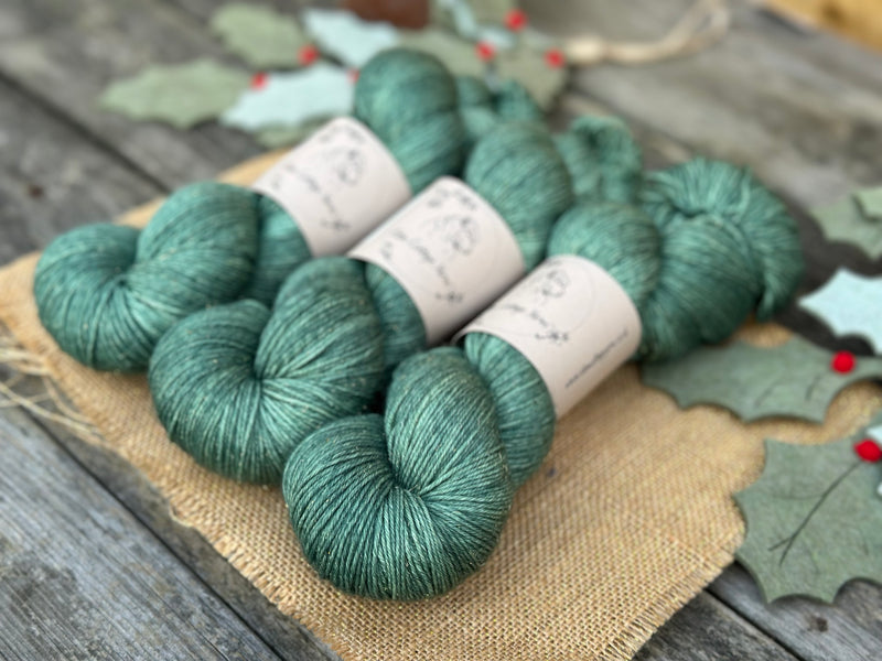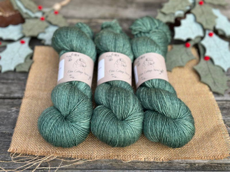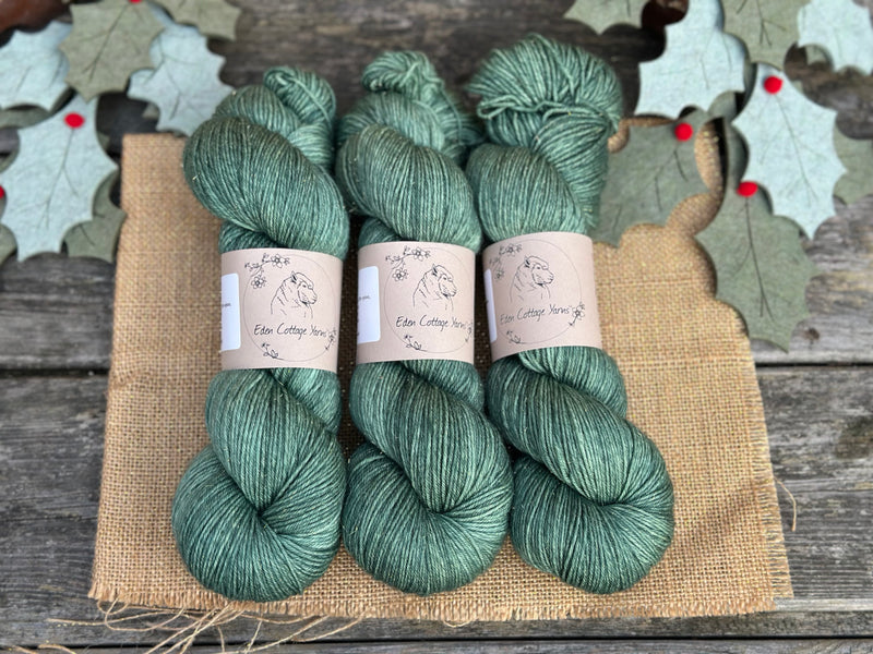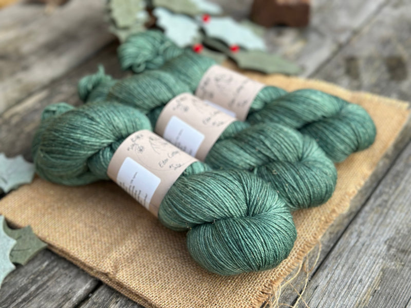 Hand dyed superwash merino, nylon and gold stellina 4ply yarn in colourway Larch - a medium-toned pine green.