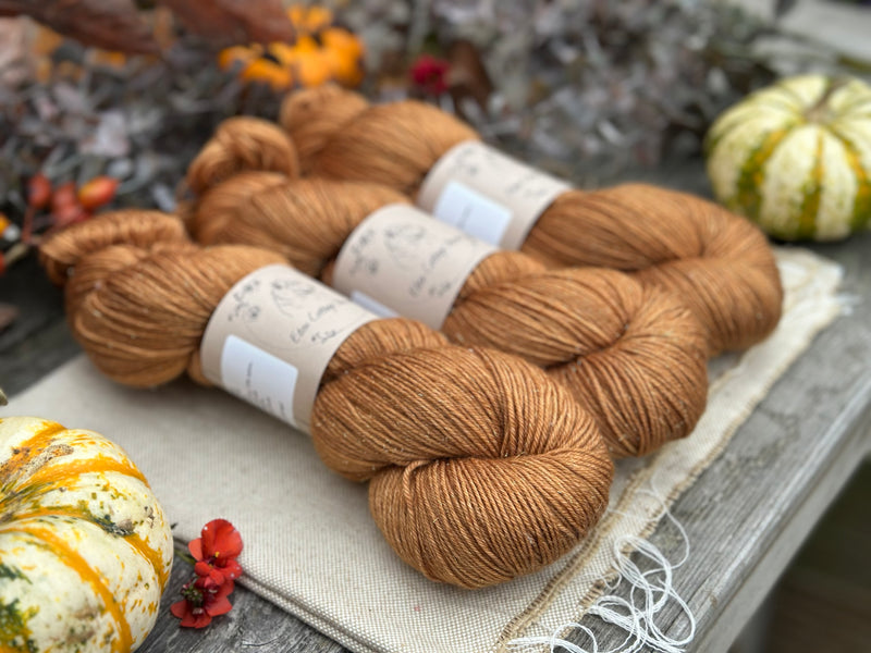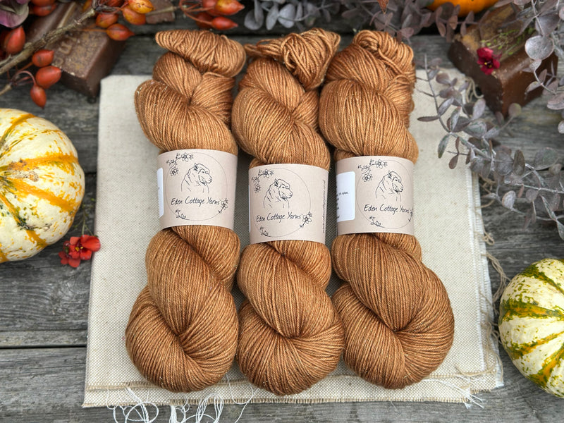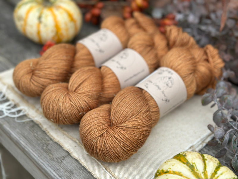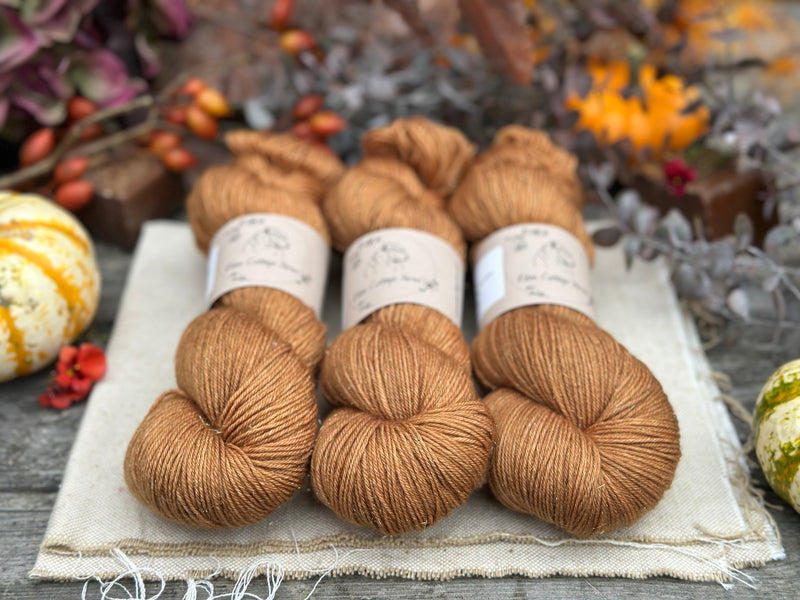 Hand dyed superwash merino, nylon and gold stellina 4ply yarn in colourway Twig - a rich, brownish gold.