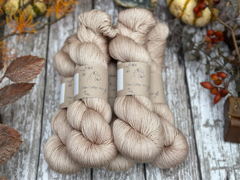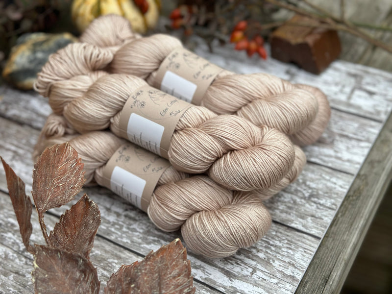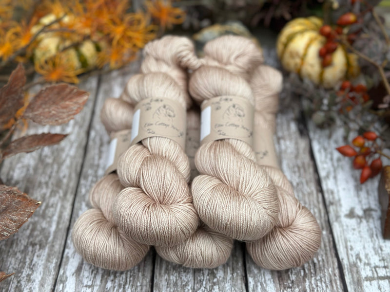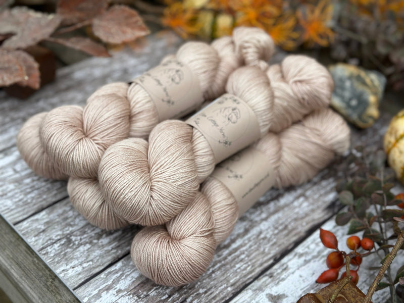 Hand dyed superwash merino and silk 4ply sock yarn in colourway Driftwood - soft, subtle, creamy beige.