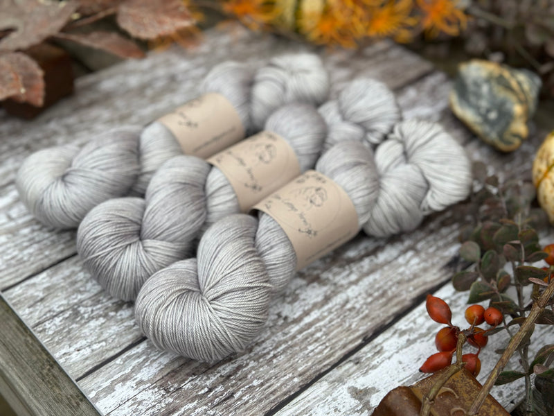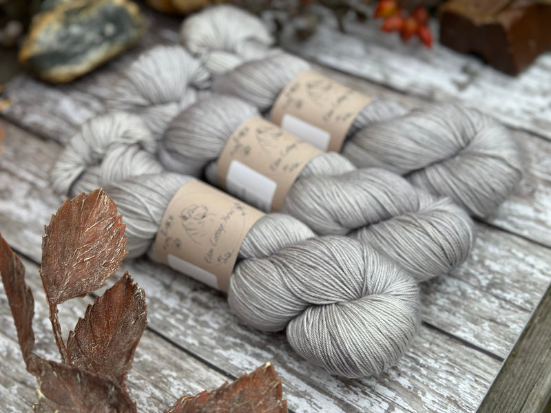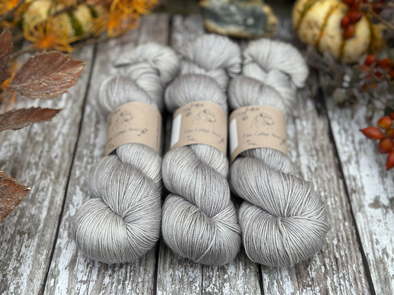 Hand dyed superwash merino and silk 4ply sock yarn in colourway Echinops - a very light, warm, silvery-blue.