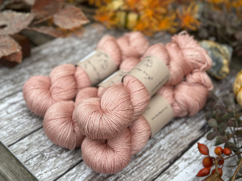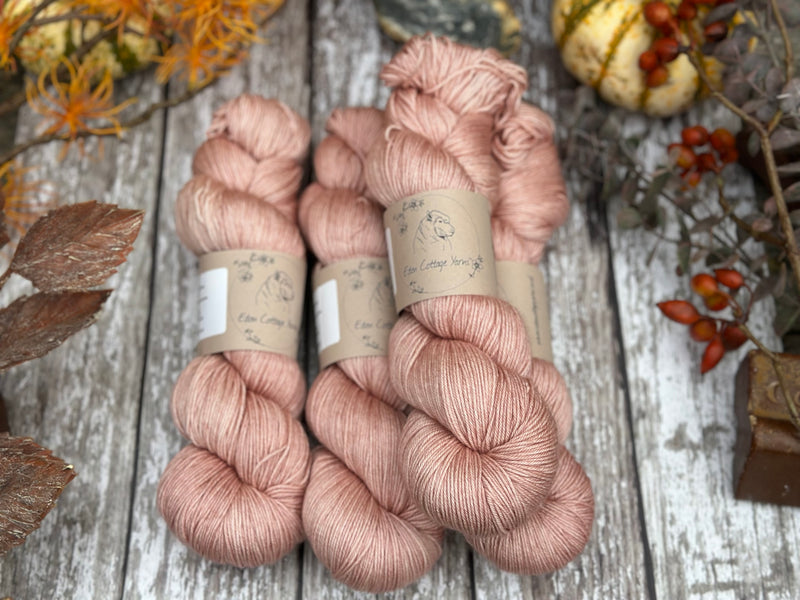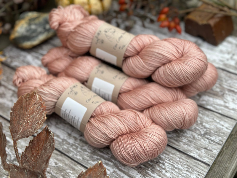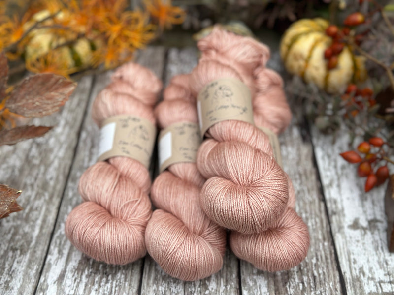 Hand dyed superwash merino and silk 4ply sock yarn in colourway Rambling Rose - light, faded, vintage-style brown-pink.