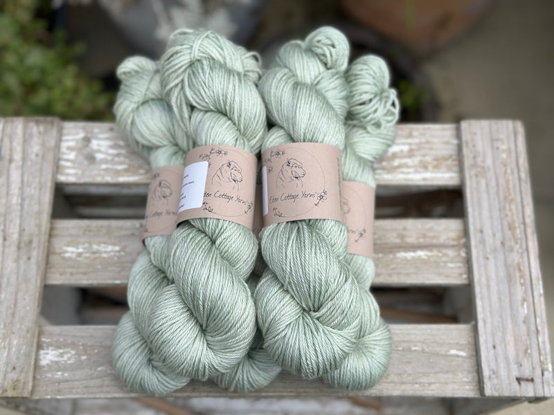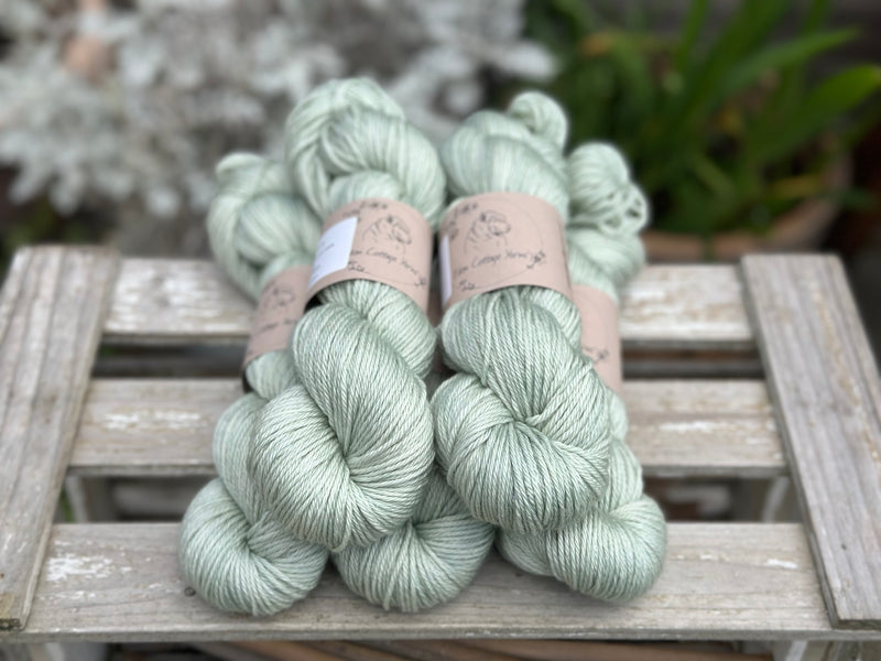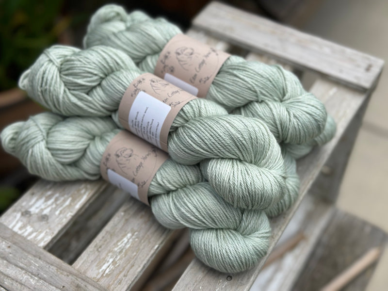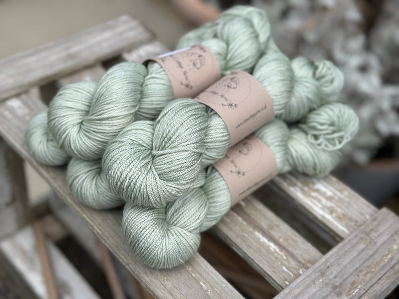 Hand dyed superwash merino and silk DK yarn in colourway Misty Woods - a soft, cool grey-green.