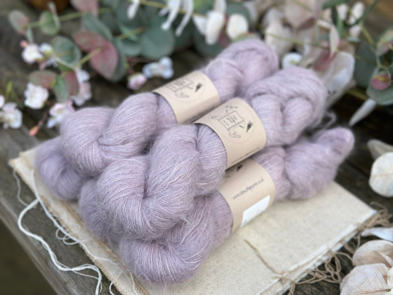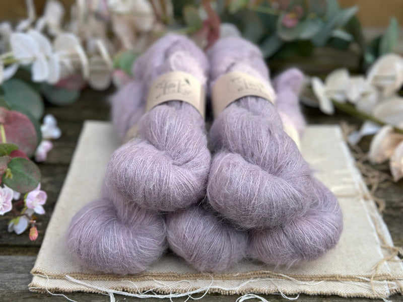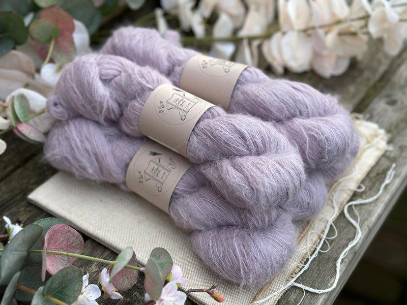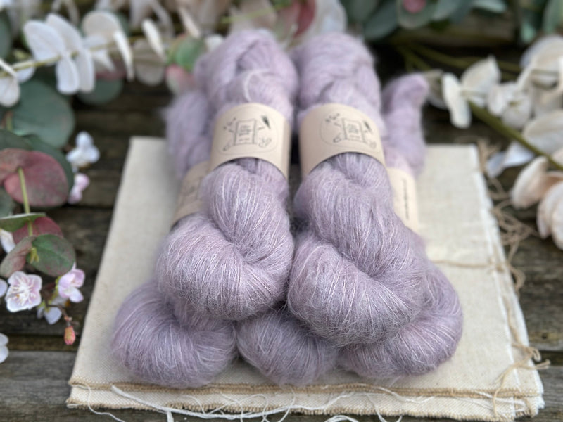 Lowther Lace is a sumptuous blend of baby suri alpaca and mulberry silk. The alpaca fibre gives this yarn a wonderful cloud-like fuzzy halo and offers a great alternative to mohair. This yarn is ideal for using on its own in both knitting and crochet and can also be held double with other yarns to add a wonderful soft, fuzzy halo. It does not have great stitch definition due to the fuzziness of the fluff so complex lace patterns might get lost in it.