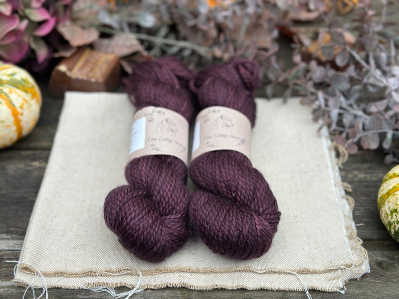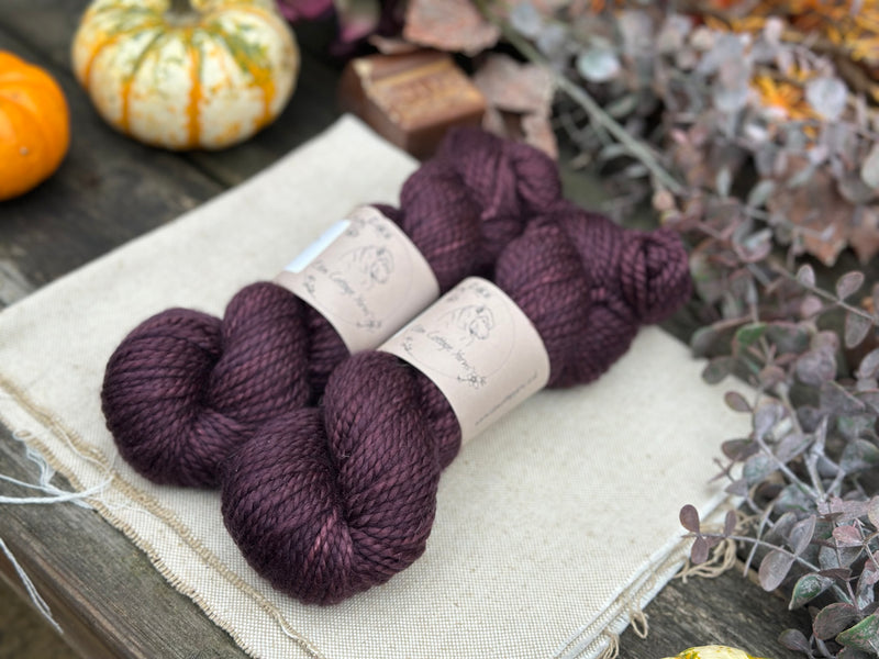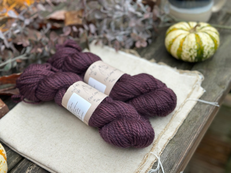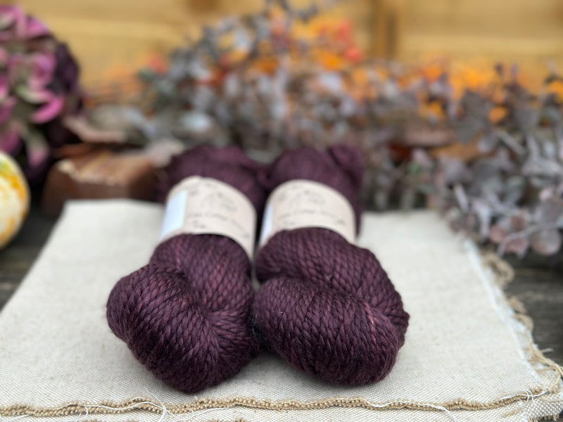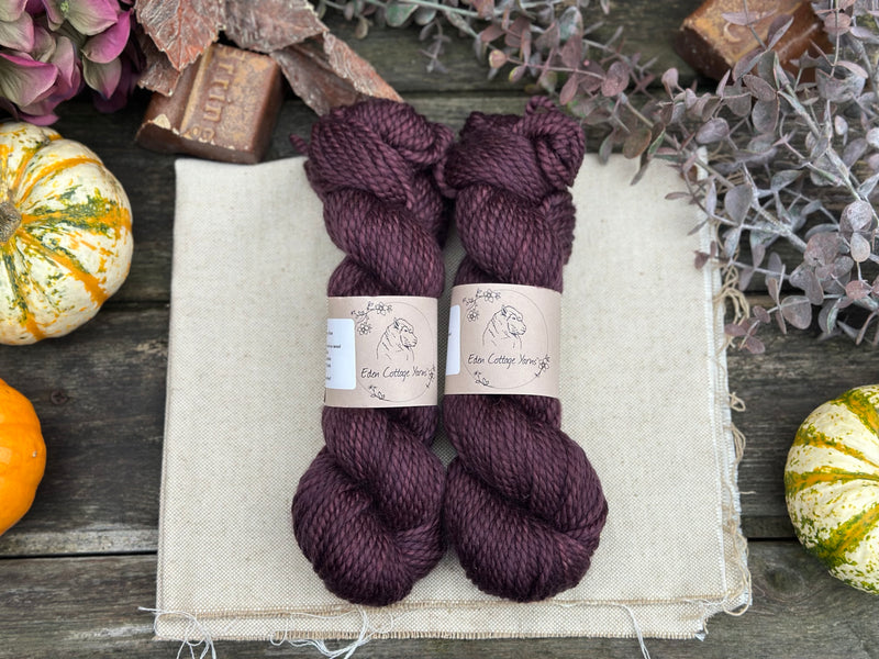 Hand dyed pure superwash merino chunky yarn in colourway Black Magic Rose - a dark velvety mauve/aubergine.