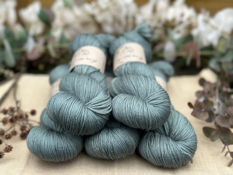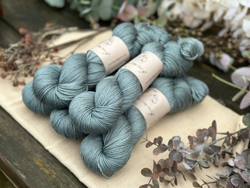 Hand dyed merino sport weight yarn in colourway Hyssop - a medium-toned stonewashed grey-teal.