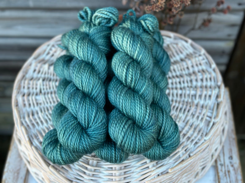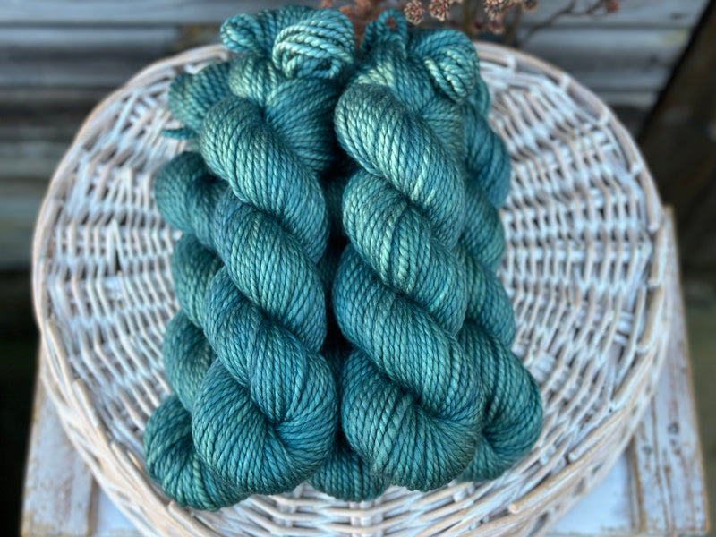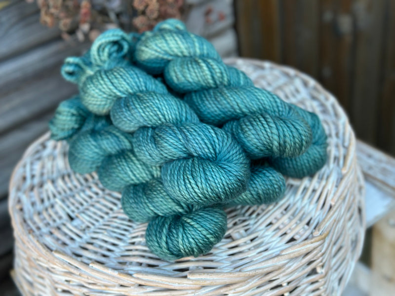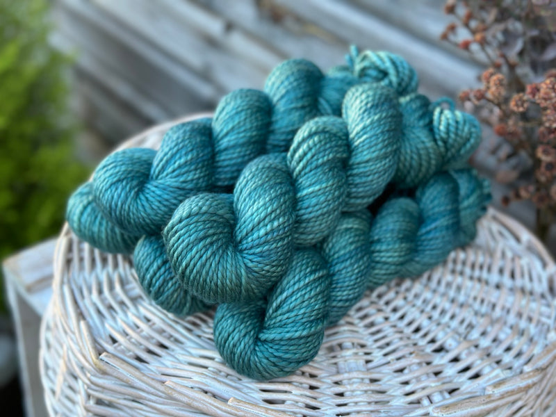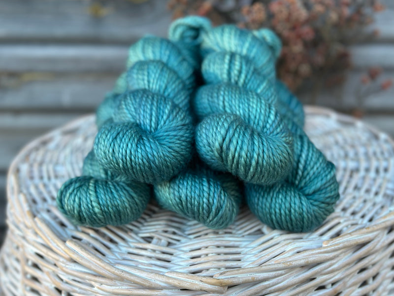 Hand dyed pure superwash merino chunky yarn in colourway Marsh - a soft shimmery turquoise.