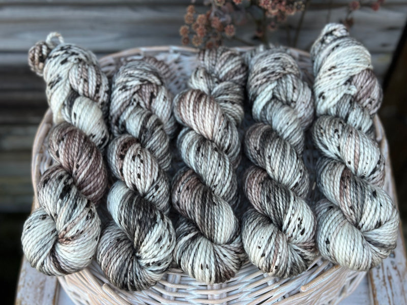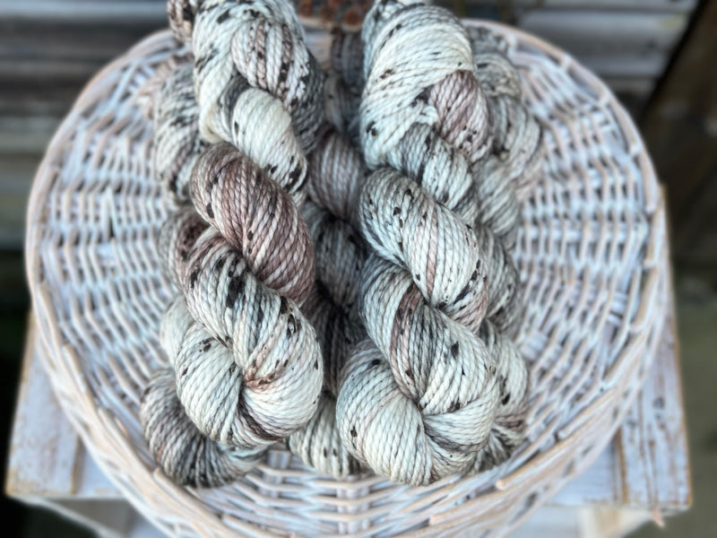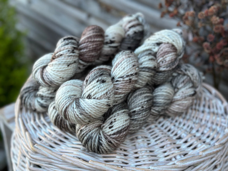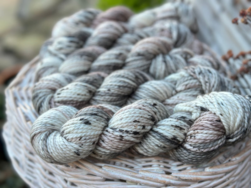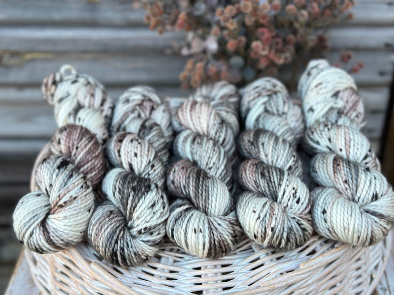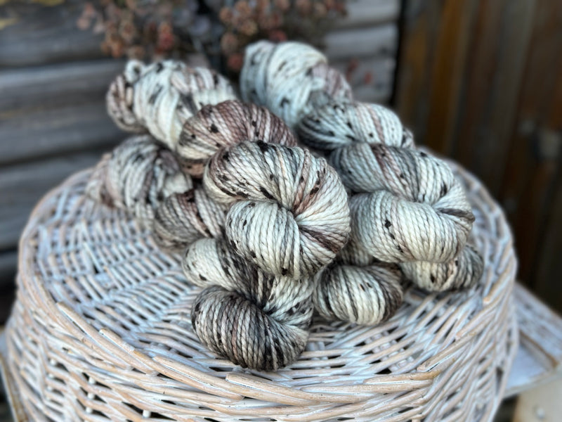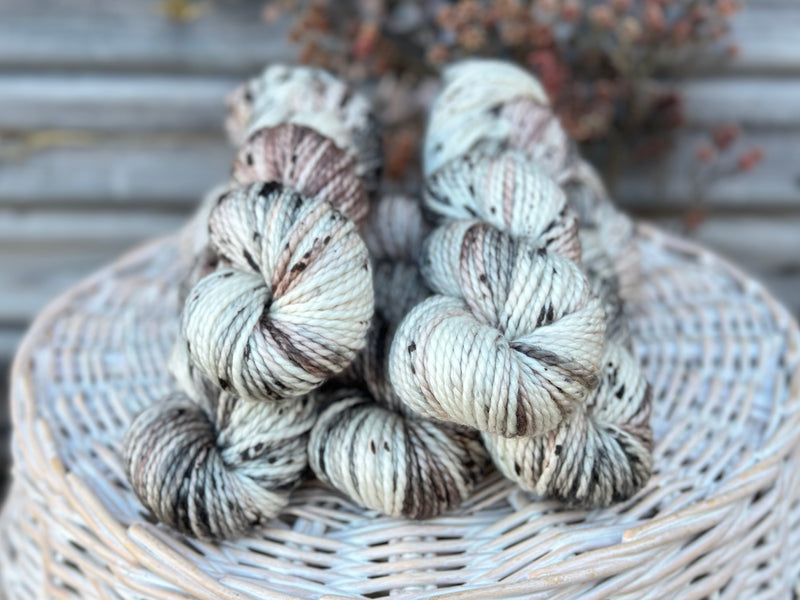 Hand dyed pure superwash merino chunky yarn in colourway Snowy Owl - a gentle mix of natural cream, soft greys and browns, and delicate sprinkles of black.
