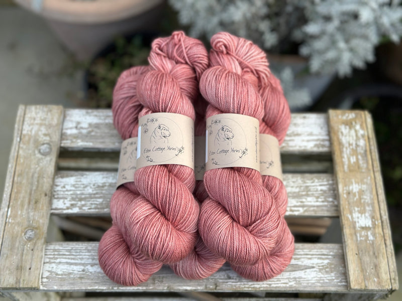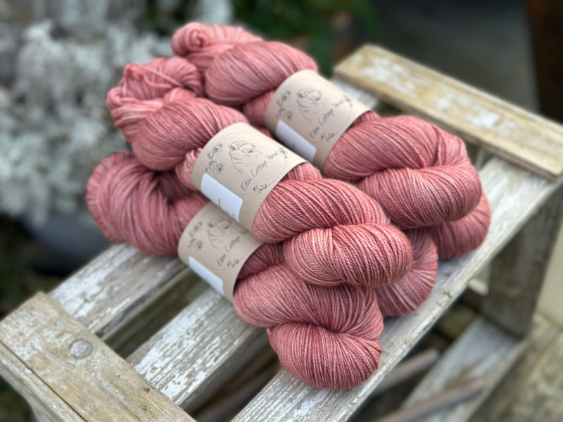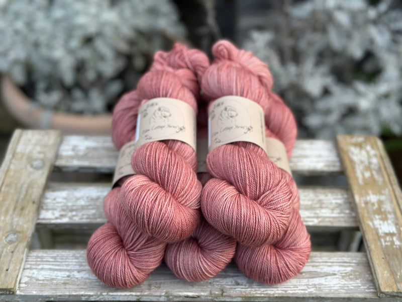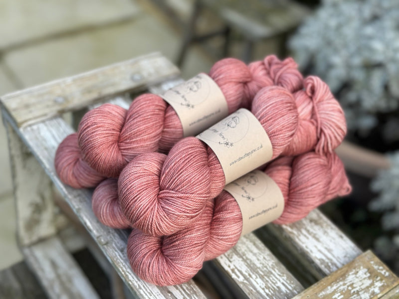 Hand dyed soft, luxurious merino/cashmere/nylon 4ply sock yarn in colourway Briar Rose - a medium-toned brown-pink.