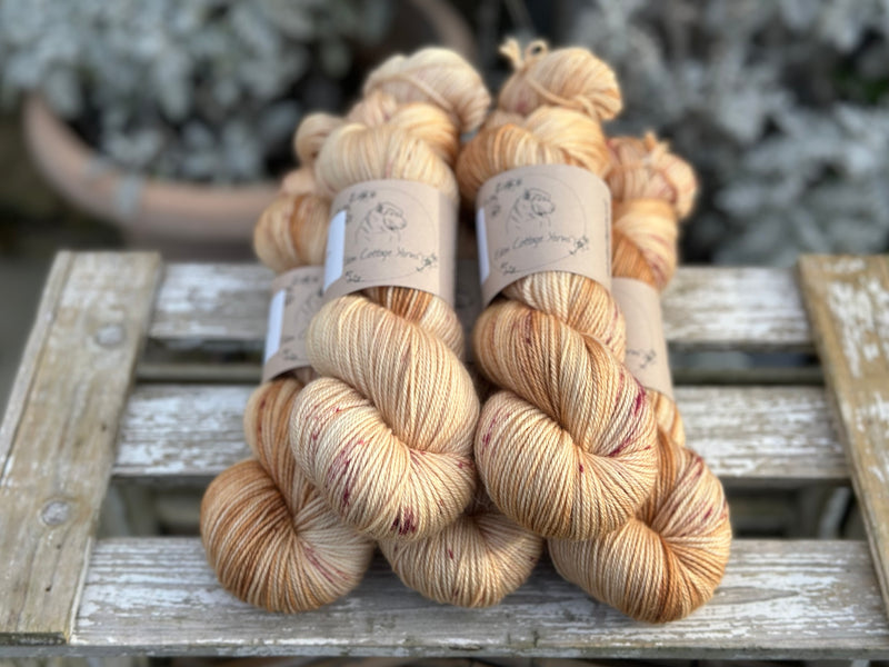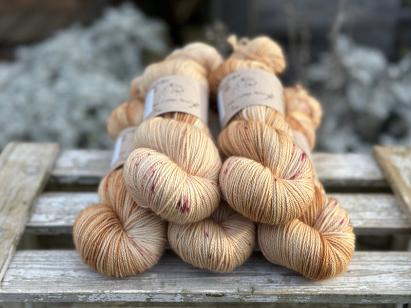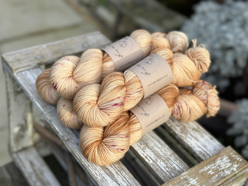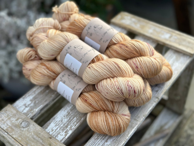 Hand dyed soft, luxurious merino/cashmere/nylon 4ply sock yarn in colourway Lunaria - a golden base colour with gentle dapples of brownish pink.