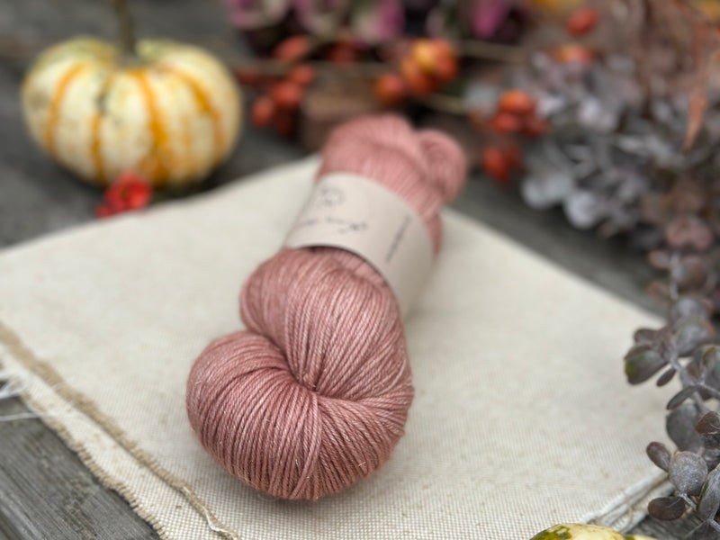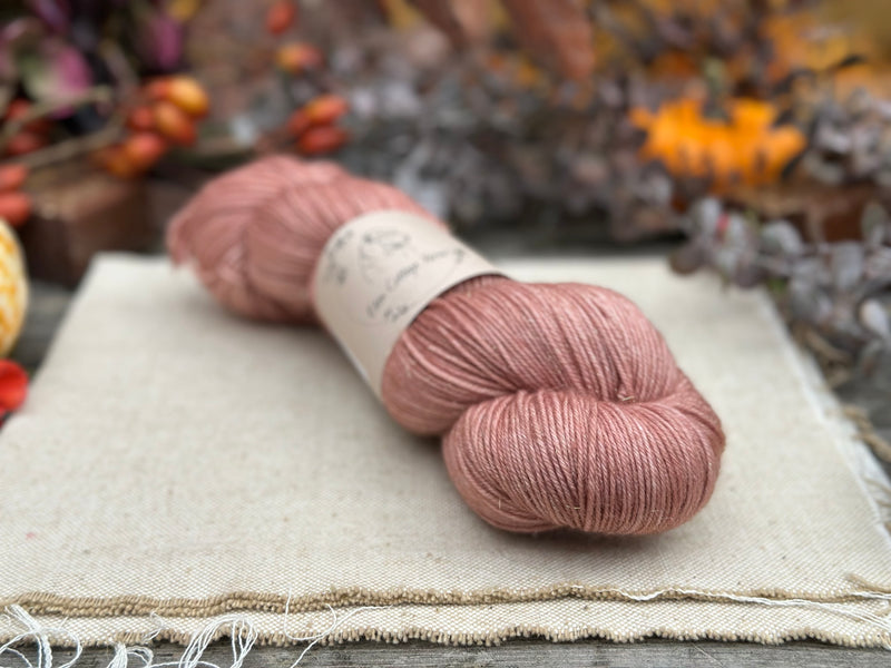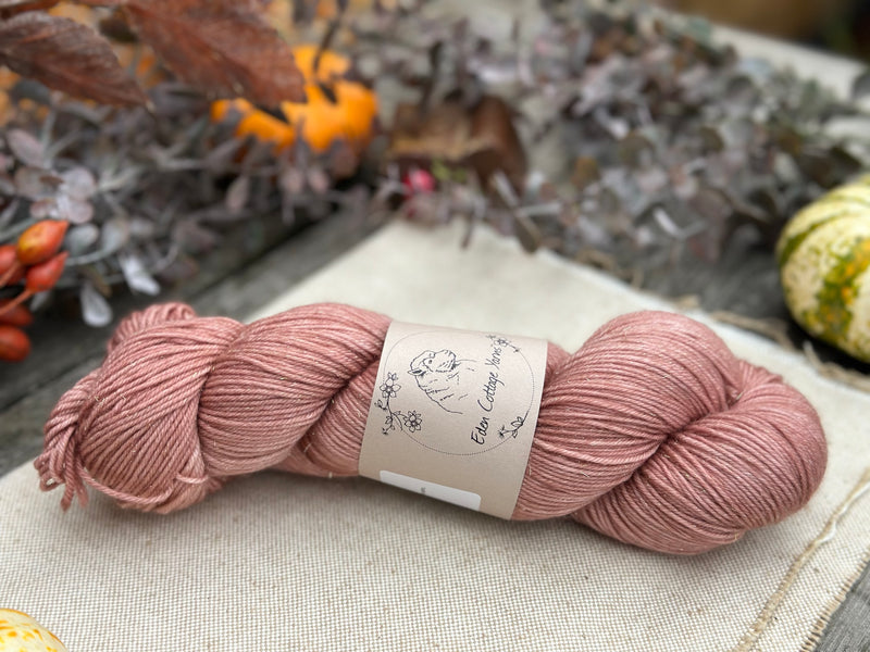 Hand dyed superwash merino, nylon and gold stellina 4ply yarn in colourway Rambling Rose - light, faded, vintage-style brown-pink.