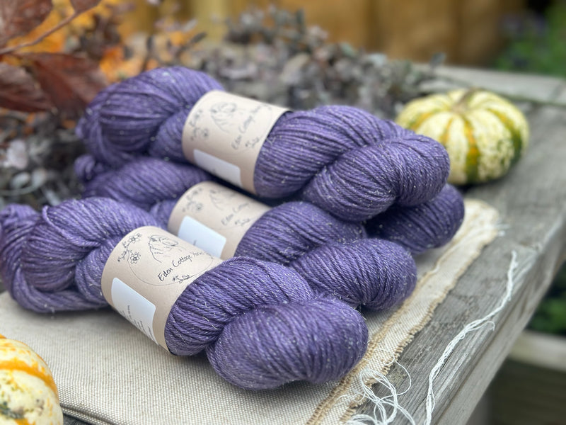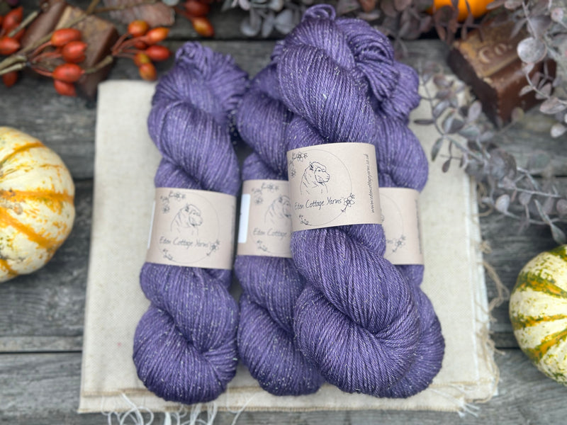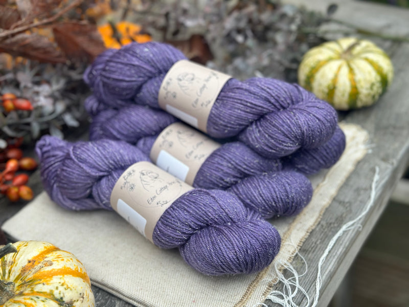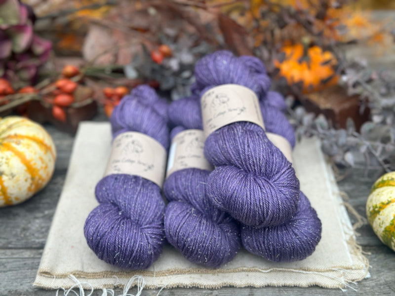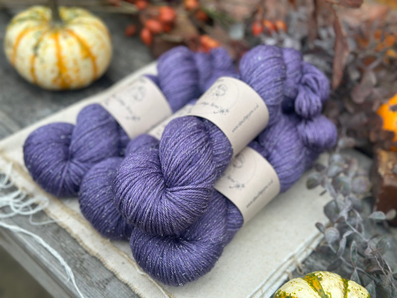 Hand dyed superwash merino, nylon and silver stellina DK yarn.
