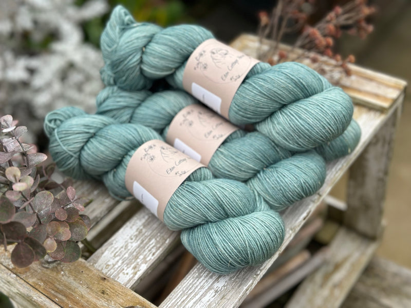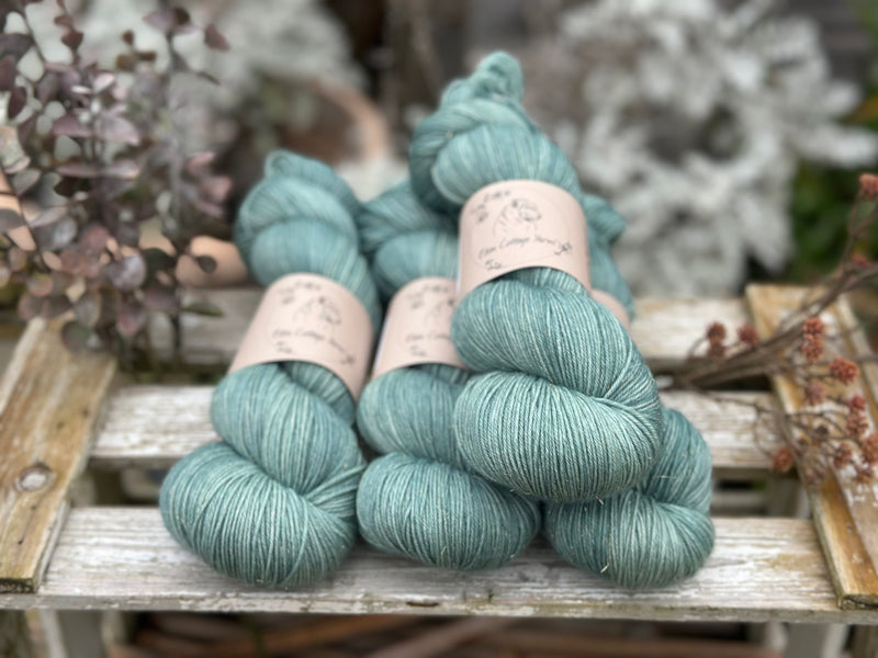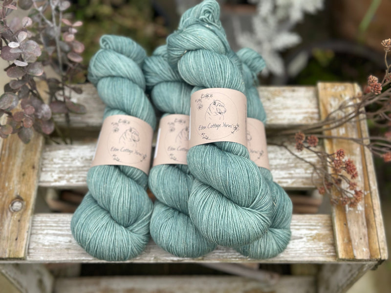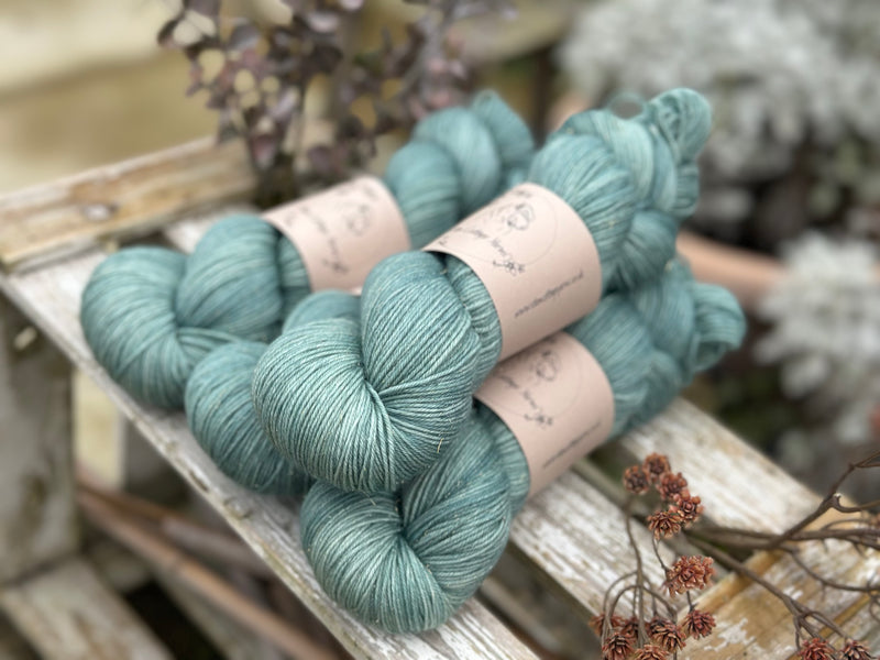 Hand dyed superwash merino, nylon and gold stellina 4ply yarn in colourway Waterfall - a soft but fairly bright turquoise.