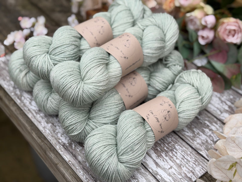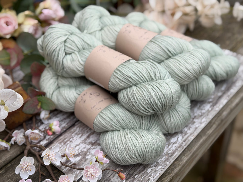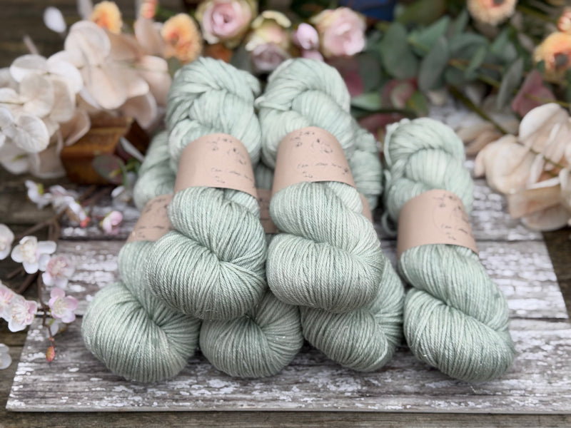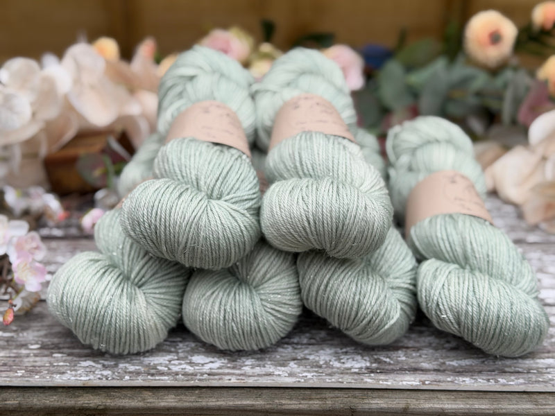Hand dyed superwash merino, nylon and silver stellina DK yarn in colourway Silver Birch - a very light and subtle slightly greenish silver.
