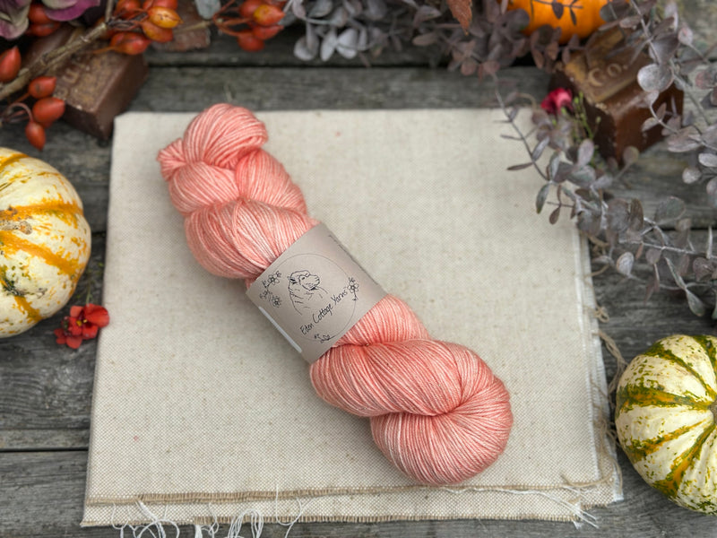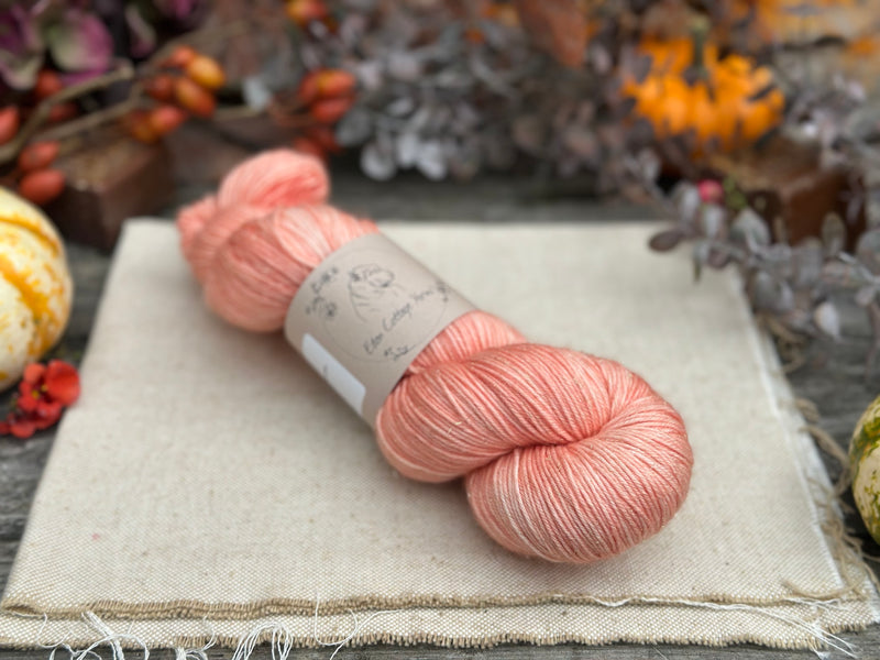 Hand dyed superwash merino, nylon and gold stellina 4ply yarn in colourway Apricot Tulip - a lovely light and quite bright apricot inspired by some of my favourite spring tulips.
