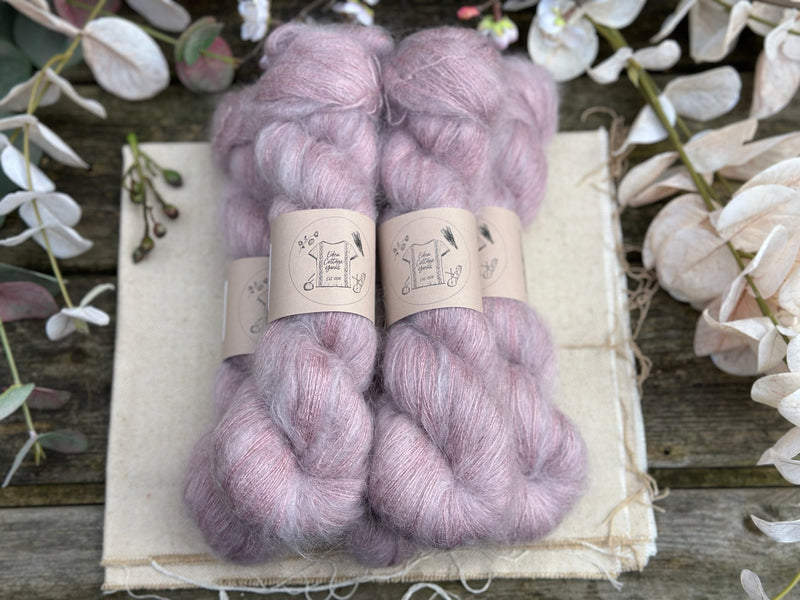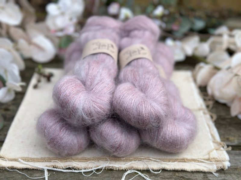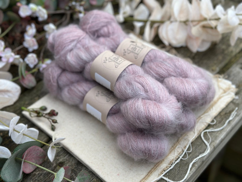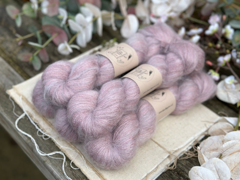 Hand dyed kid mohair/silk laceweight yarn in colourway Meadow Rue.