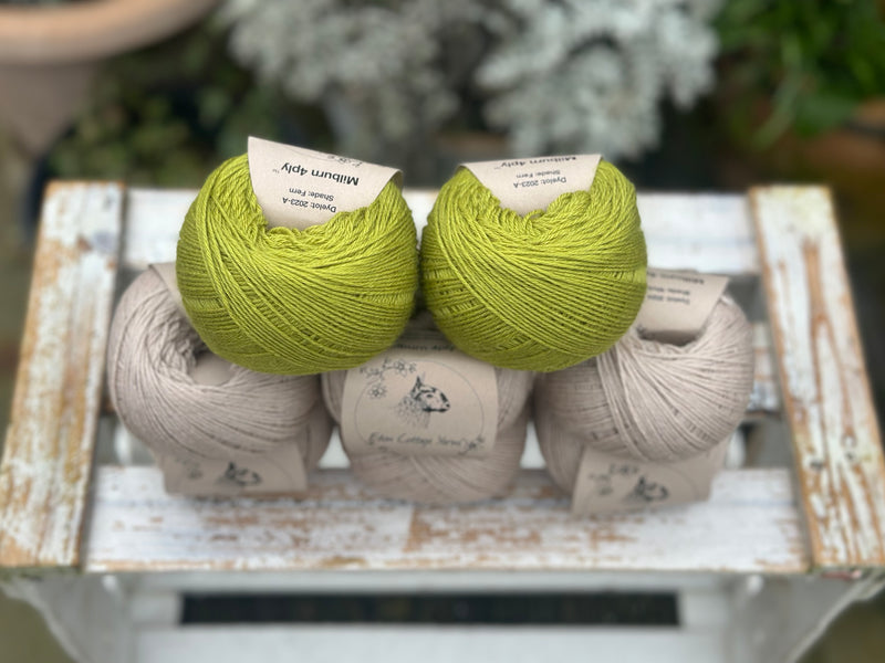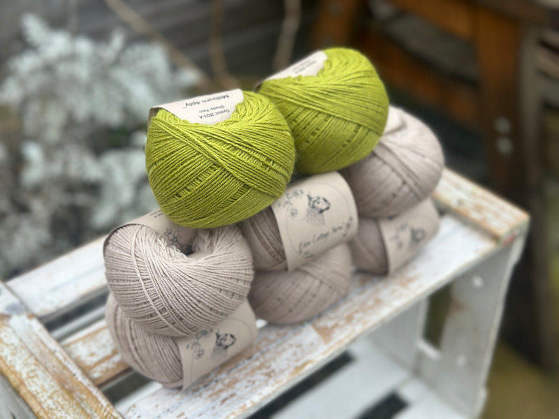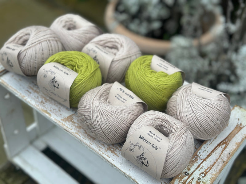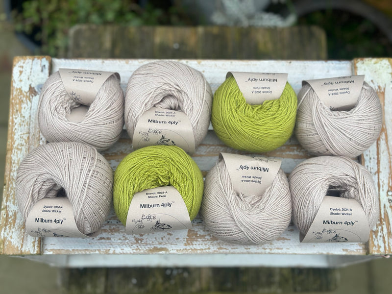 The pattern calls for three 100g skeins of my Brimham High Twist 4ply in Stone and one 100g skein of sparkly Rosedale 4ply in Fern. However, because my hand dyed yarns are produced in small batches they're not always in stock, so this is where Milburn 4ply™️ comes in. It is mill dyed to my specifications and is usually in stock. The blend in it is superwash Bluefaced Leicester wool and silk, so it's great for shawls. Wicker and Fern are the closest colours to the ones in the pattern so you will receive six 50g balls of Wicker and two 50g balls of Fern if you opt for this yarn pack.