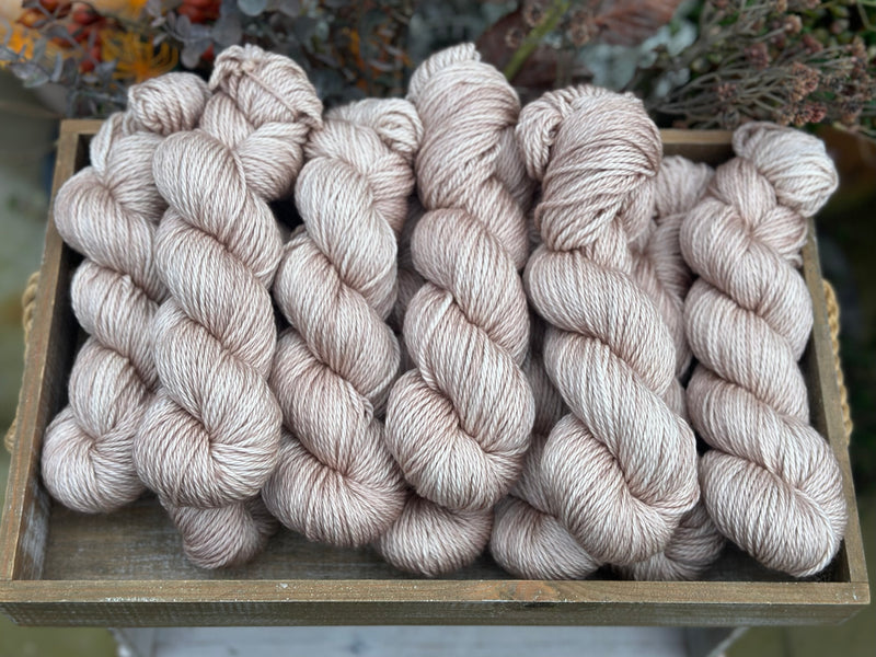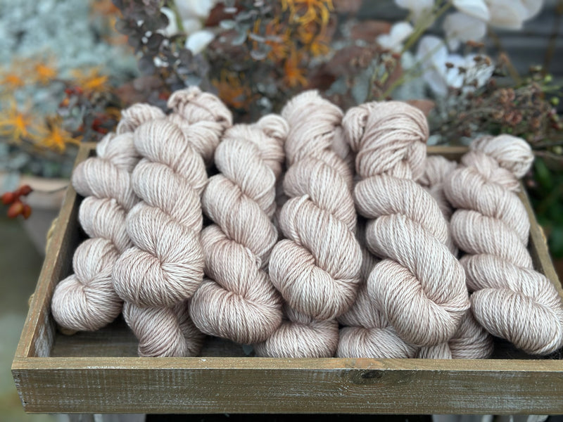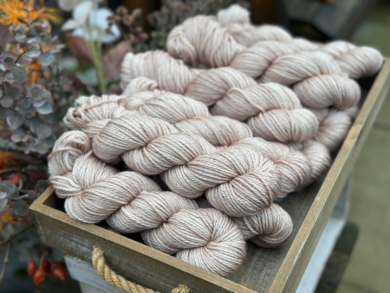 Hand dyed superwash 100% merino aran in colourway Driftwood - soft, subtle, creamy beige.