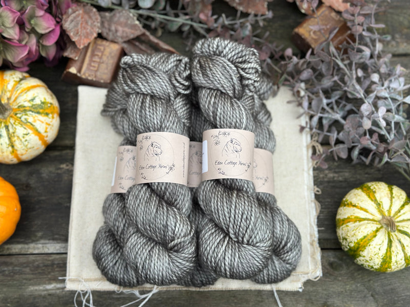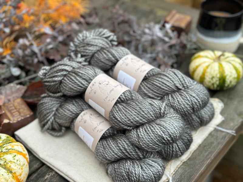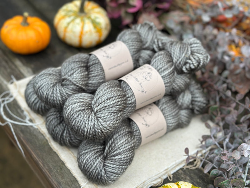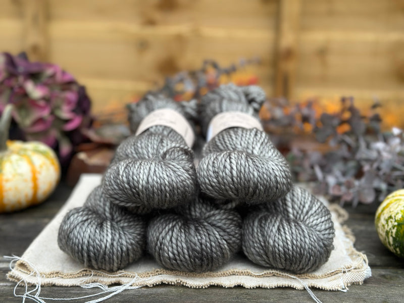 Hand dyed pure superwash merino chunky yarn in colourway Ash - this is a semi-solid grey, slightly darker than Steel but not as dark as Charcoal.