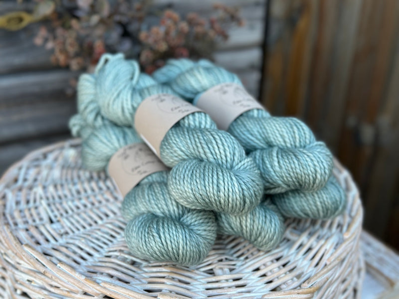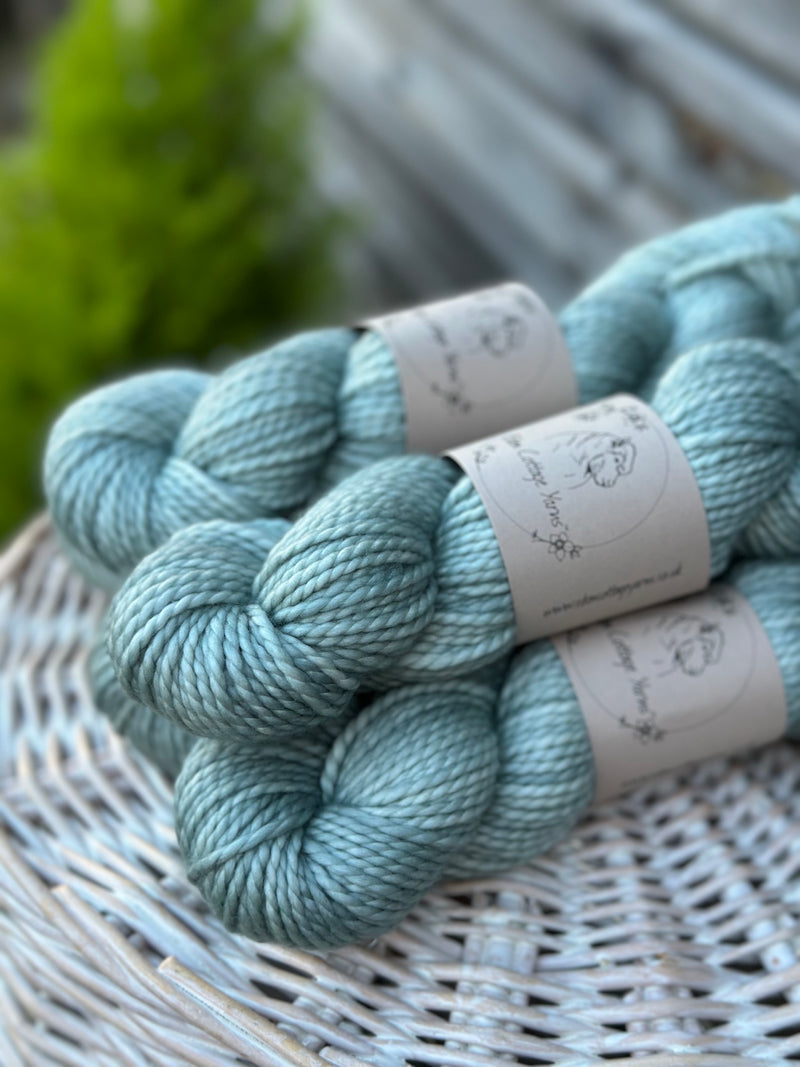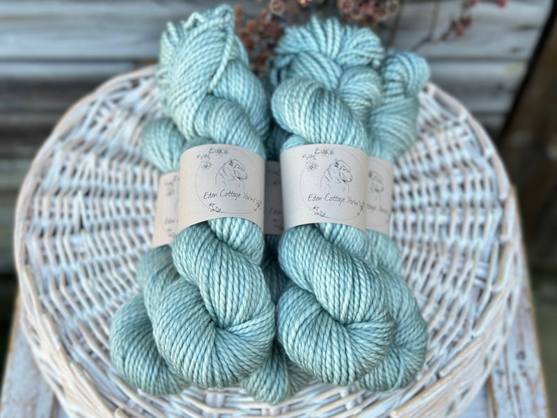 Hand dyed pure superwash merino chunky yarn in colourway Robin Egg - a gorgeous, springy, soft grey-turquoise.