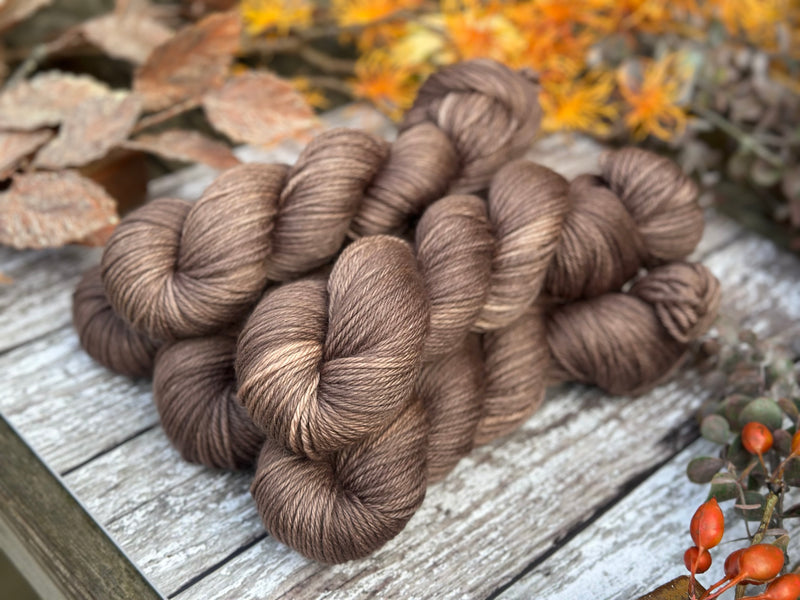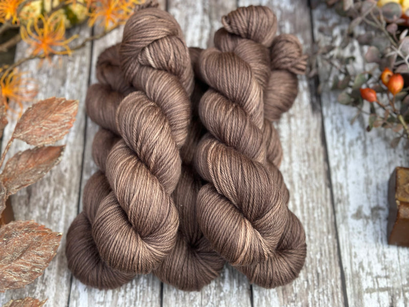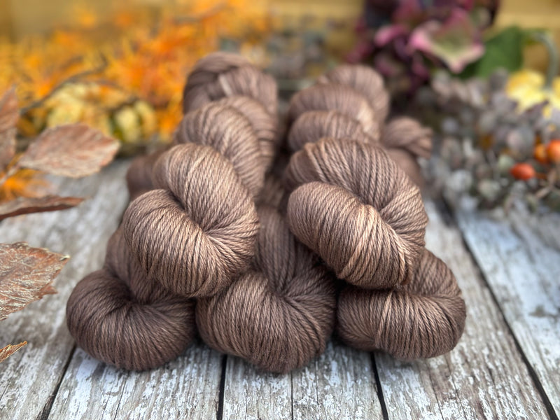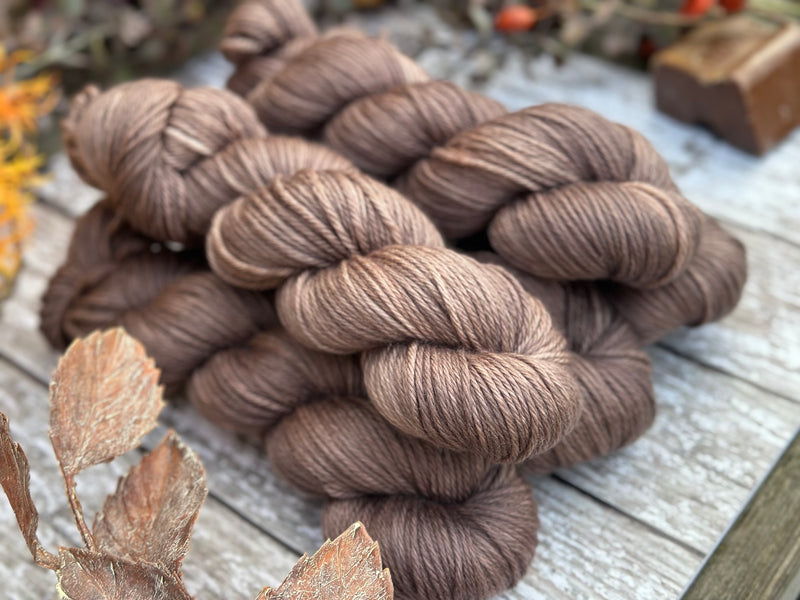 Hand dyed superwash pure merino DK yarn in colourway Compost - medium to dark brown.