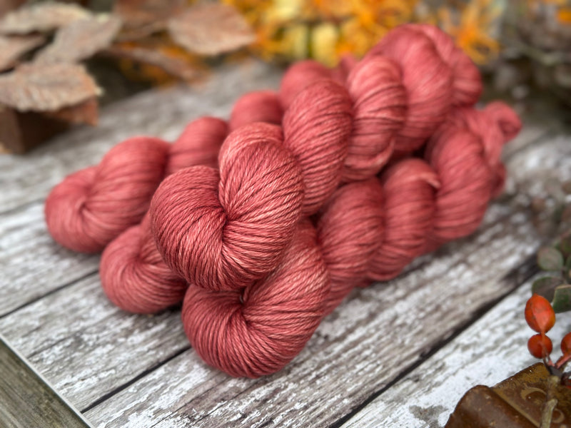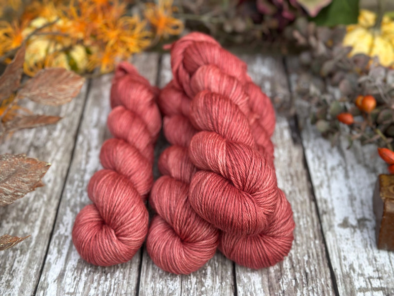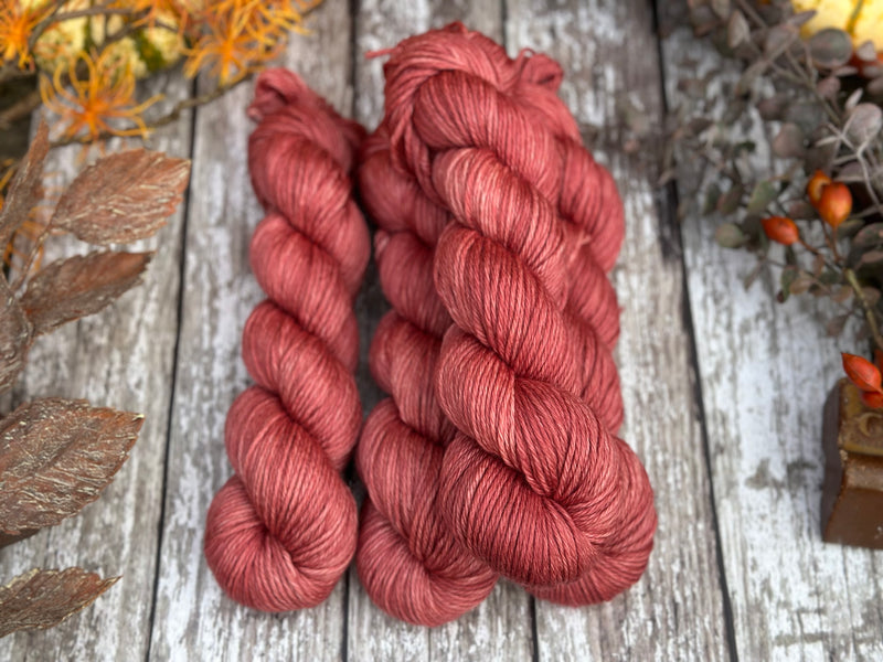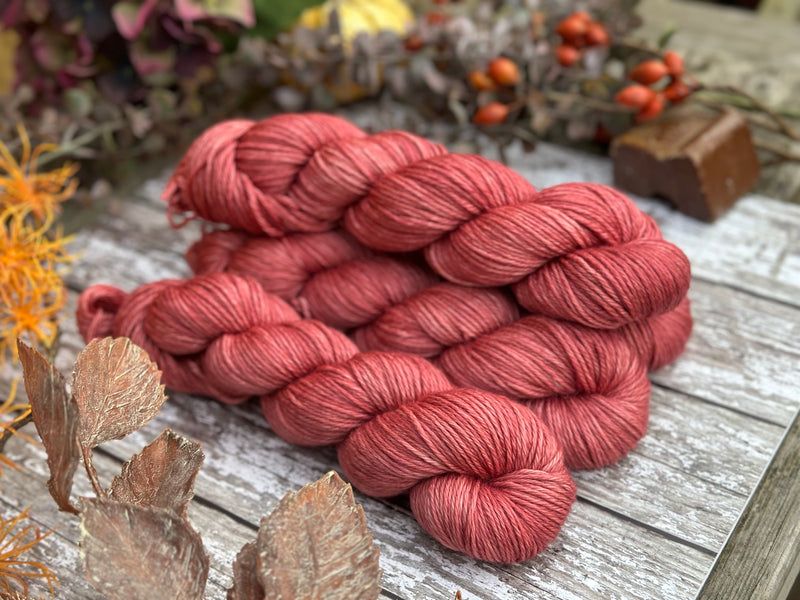 Hand dyed superwash pure merino DK yarn in colourway Diascia - a soft faded rusty red.