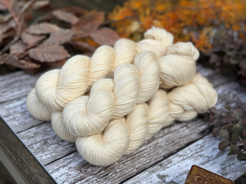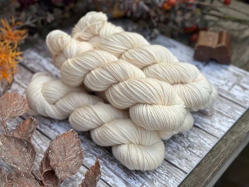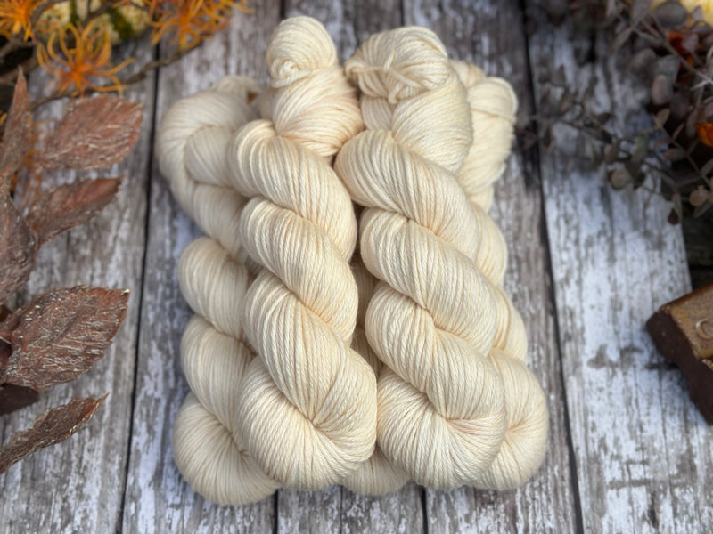 Hand dyed superwash pure merino DK yarn in colourway Linen - a very subtle semi-solid barely-there cream. (Note that the skeins this batch have more pinkish tonal variation than usual - it's very subtle but is there)