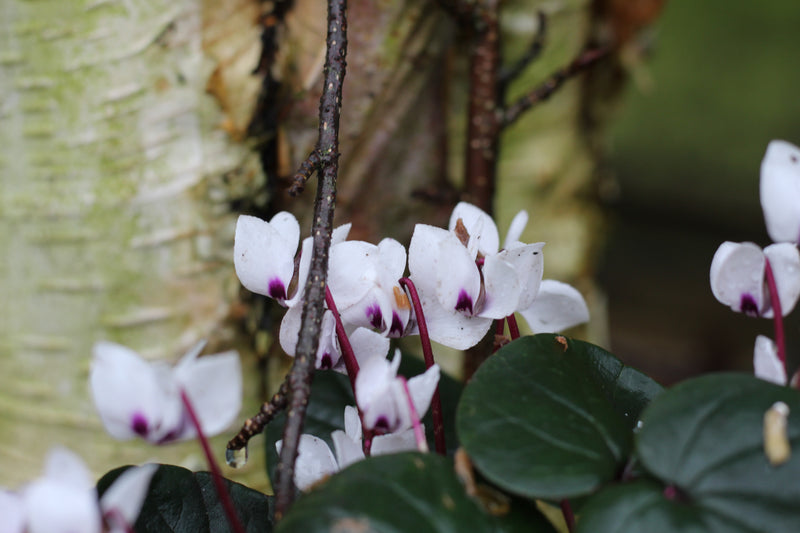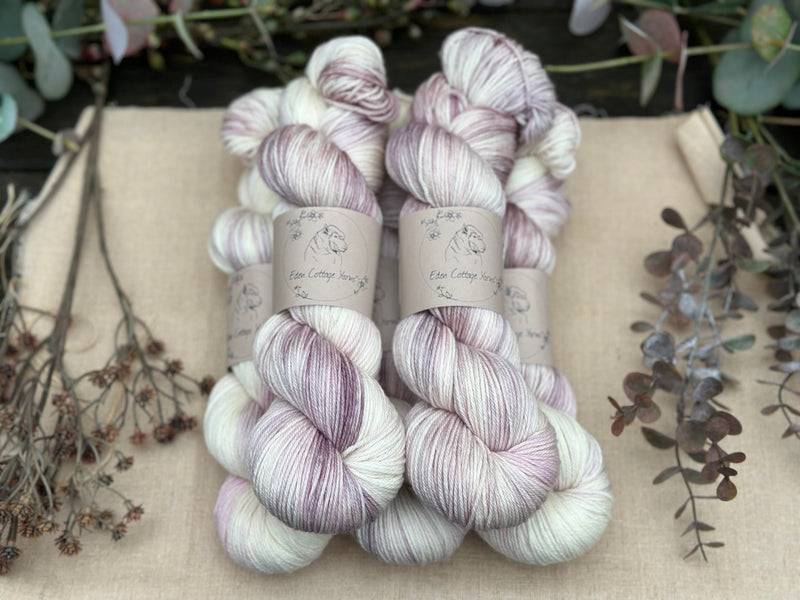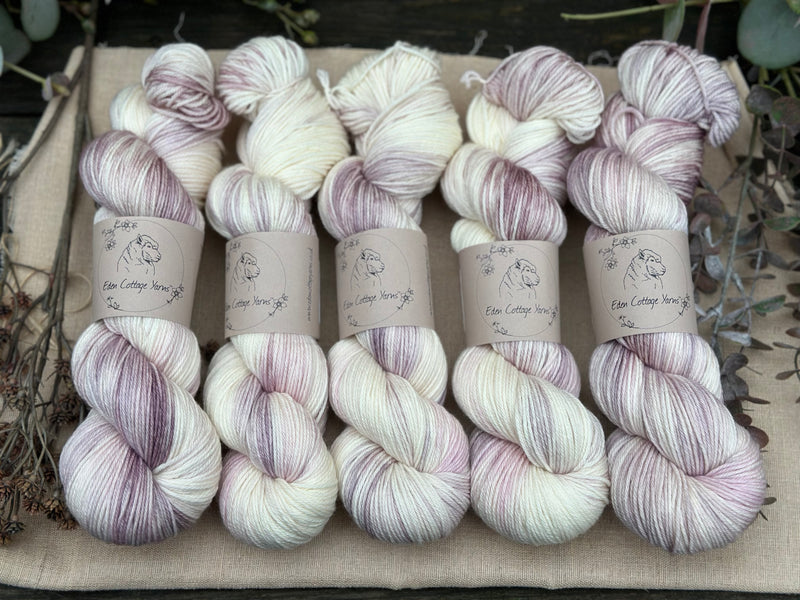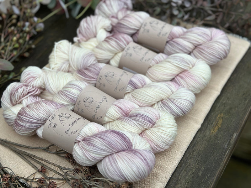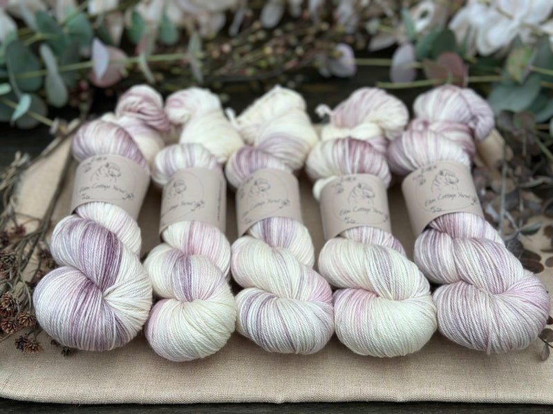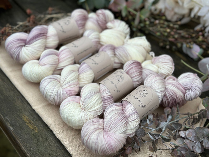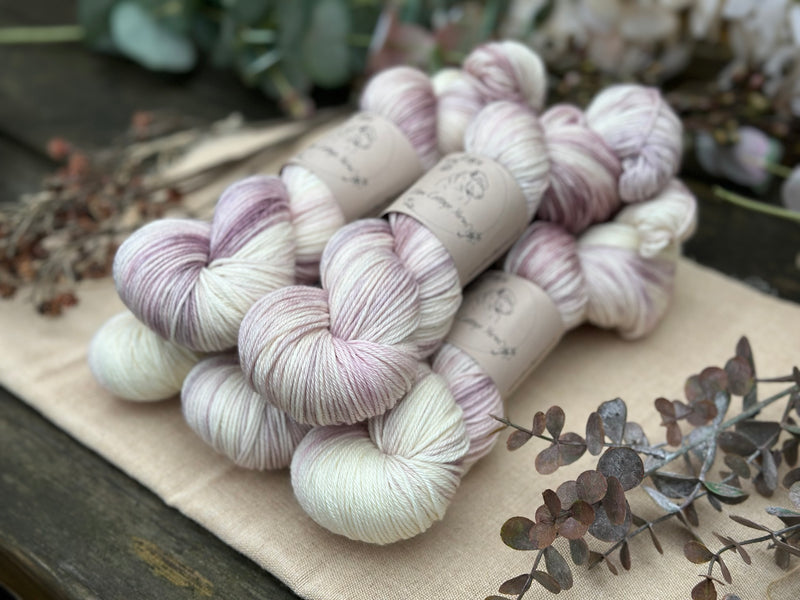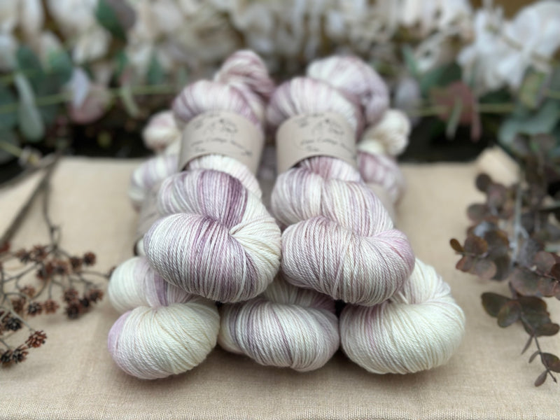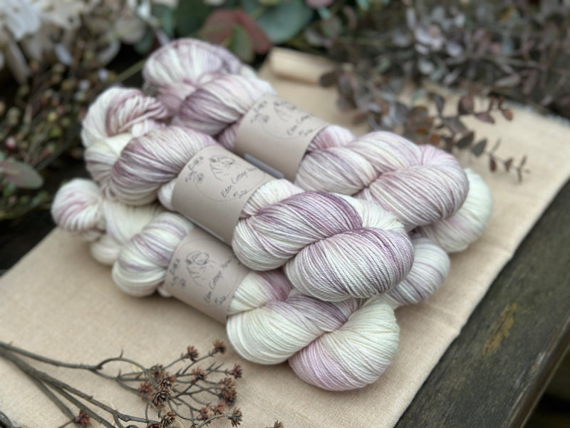 Hand dyed merino sport weight yarn in colourway Cyclamen - inspired by the the first burst of colour in my garden in January, this is is a mix of white, pinks, and purple.