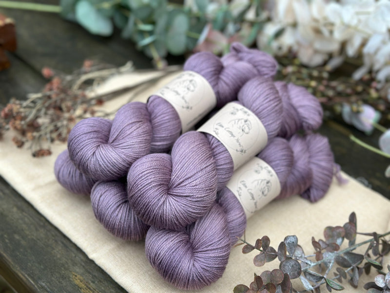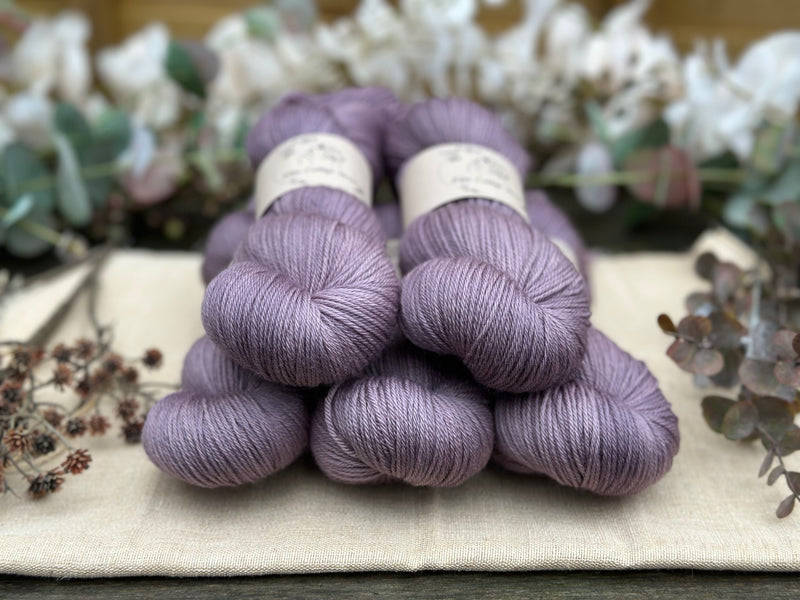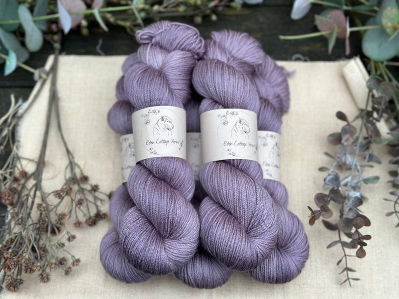 Hand dyed merino sport weight yarn in colourway Thunder - a medium- to dark-toned faded grey-purple.