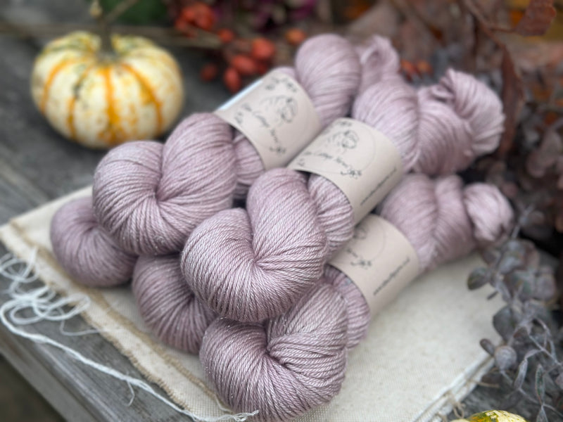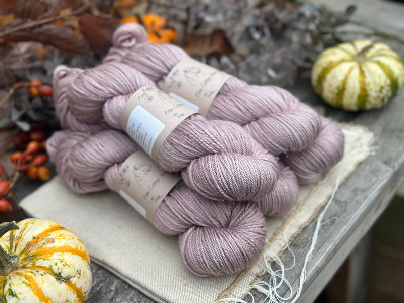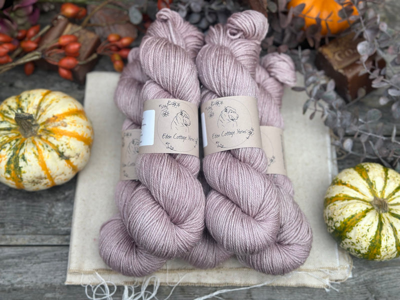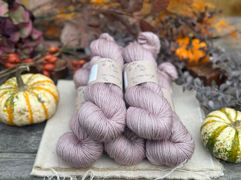 Hand dyed superwash merino, nylon and silver stellina DK yarn in colourway Smoky Taupe - very soft dusty pink which can also look like a soft brown in certain lights.