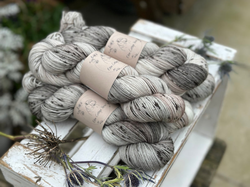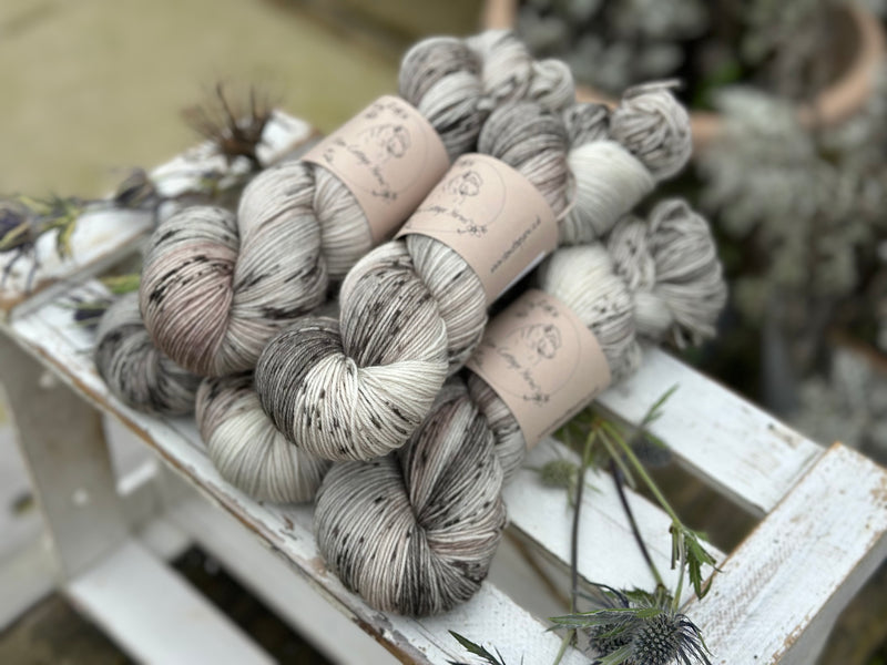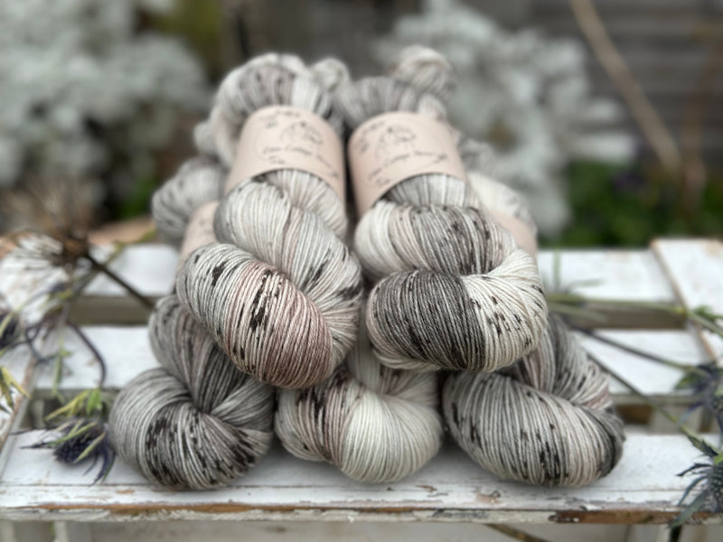 Hand dyed 75% superwash merino, 25% nylon 4ply sock yarn in colourway Snowy Owl - a gentle mix of natural cream, soft greys and browns, and delicate sprinkles of black.